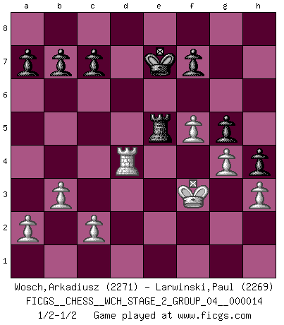 Last move : 1/2-1/2 2015 November 6 19:15:51 [Event "FICGS__CHESS__WCH_STAGE_2_GROUP_04__000014"] [Site "FICGS"] [Date "2015.09.05"] [Round "1"] [White "Wosch,Arkadiusz"] [Black "Larwinski,Paul"] [Result "1/2-1/2"] [WhiteElo "2271"] [BlackElo "2269"] 1.e4 e5 2.Nf3 Nc6 3.Bb5 Nf6 4.O-O Nxe4 5.d4 Nd6 6.Bxc6 dxc6 7.dxe5 Nf5 8.Qxd8+ Kxd8 9.Nc3 Ke8 10.h3 Be7 11.Bg5 Bxg5 12.Nxg5 h6 13.Nf3 Be6 14.Rad1 Rd8 15.b3 c5 16.Kh2 Ke7 17.g4 Nd4 18.Nxd4 Rxd4 19.f4 h5 20.Kg3 h4+ 21.Kf3 Rhd8 22.f5 Bd5+ 23.Nxd5+ R8xd5 24.Rxd4 cxd4 25.Rd1 Rxe5 26.Rxd4 g5 1/2-1/2 Ruy Lopez : Berlin defense, Open variation Kingside Castling by player White (move 4) This chess game ended in a draw. Follow this game move after move (download)No price is too great for the scalp of the enemy King. (Koblentz) Fallen sollten polizeilich verboten werden. (Savielly Grigorievitsch Tartakower) El Ajedrez es un mar en el cual un mosquito puede beber y un elefante puede bañarse. (Refrán Hindú) Le jeu d'échecs fait naître et fortifie en nous plusieurs qualités précieuses dans le cours de l'existence, telles que la prévoyance, la circonspection, la prudence, et la persévérance. (Benjamin Franklin - 1783, la morale des échecs) The ultimate in disposing one's troops is to be without ascertainable shape. Then the most penetrating spies cannot pry in nor can the wise lay plans against you. (Sun Tzu)