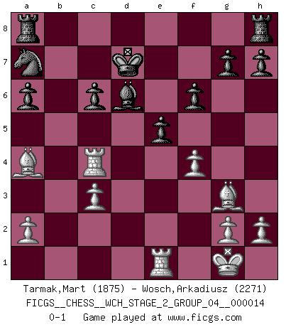 Last move : 0-1 2015 December 25 21:44:47 [Event "FICGS__CHESS__WCH_STAGE_2_GROUP_04__000014"] [Site "FICGS"] [Date "2015.09.05"] [Round "1"] [White "Tarmak,Mart"] [Black "Wosch,Arkadiusz"] [Result "0-1"] [WhiteElo "1875"] [BlackElo "2271"] 1.e4 c5 2.Nf3 Nc6 3.c3 Nf6 4.e5 Nd5 5.Bc4 Nb6 6.Bb3 c4 7.Bc2 Qc7 8.O-O Nxe5 9.Nxe5 Qxe5 10.Re1 Qc7 11.d3 cxd3 12.Qxd3 d6 13.Na3 a6 14.Be3 e6 15.Rad1 Bd7 16.Qd4 Nc8 17.Bf4 Qb6 18.Qd3 Qxb2 19.Nc4 Qb5 20.Qd4 Qc5 21.Qxc5 dxc5 22.Ne5 Bc6 23.Nxc6 bxc6 24.Ba4 Na7 25.Be5 c4 26.Rd4 f6 27.Bg3 e5 28.Rxc4 Kd7 29.f4 Bd6 0-1 This chess game has been lost on time (started : 2015.09.05 22:55:46) Mart Tarmak 30. fxe5 Sicilian defense Kingside Castling by player White (move 8) Player Black won this chess game. Follow this game move after move (download)Every Chess master was once a beginner. (Chernev) Frage: Was machen Sie mit den Preisen? Anwort: Ich habe Angst, dass meine Freundin davon neue Kleider kauft. (Loek van Wely) Jugadores de primera clase pierden en contra de jugadores de segunda clase porque los jugadores de segunda clase a veces juegan una partida de primer clase. (Siegbert Tarrasch) Mais n'est-ce pas déjà le limiter injurieusement que d'appeler les échecs un jeu? N'est-ce pas aussi une science, un art, ou quelque chose qui, comme le cercueil de Mahomet entre ciel et terre, est suspendu entre l'un et l'autre, et qui réunit un nombre incroyable de contraires ? (Stefan Zweig) The problem with troubleshooting is that trouble shoots back. (Anonymous)
