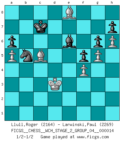 Last move : 1/2-1/2 2016 January 6 17:26:17 [Event "FICGS__CHESS__WCH_STAGE_2_GROUP_04__000014"] [Site "FICGS"] [Date "2015.09.05"] [Round "1"] [White "Llull,Roger"] [Black "Larwinski,Paul"] [Result "1/2-1/2"] [WhiteElo "2164"] [BlackElo "2269"] 1.e4 e5 2.Nf3 Nc6 3.Bb5 a6 4.Ba4 Nf6 5.O-O Be7 6.Re1 b5 7.Bb3 d6 8.c3 O-O 9.h3 Bb7 10.d4 Nd7 11.Nbd2 exd4 12.cxd4 Re8 13.Nf1 Na5 14.Bc2 Bf6 15.Qd3 g6 16.N1h2 c5 17.Ng4 cxd4 18.Nxf6+ Qxf6 19.Bg5 Qg7 20.Qxd4 Nc4 21.a4 Qxd4 22.Nxd4 b4 23.f3 Nc5 24.b3 Na3 25.Rec1 d5 26.Bd1 Rac8 27.exd5 Bxd5 28.a5 Ne6 29.Nxe6 Bxe6 30.Rxc8 Rxc8 31.Rc1 Rxc1 32.Bxc1 Nb5 33.Be3 Kf8 34.Bc5+ Ke8 35.Bc2 Na3 36.Bd3 Nb5 37.Bxb4 Bxb3 38.Kf2 Nc7 39.Bd6 Nb5 40.Bf4 Kd7 41.Kg3 Be6 42.Bd2 f6 43.Kf4 Kc6 44.h4 Nc7 45.Kg3 Kd7 46.Be3 Nb5 47.Kf4 Nc7 48.Bd4 Ke7 49.Bc5+ Ke8 50.g4 Bc8 51.Bd6 Nb5 52.Bb4 Nc7 53.Bd2 Kf7 54.Ke3 Nb5 55.h5 Kg7 56.Kf2 Kf7 57.h6 Be6 58.Ke3 Bd7 59.Be2 Bc8 60.f4 f5 61.g5 Bb7 62.Bc4+ Ke8 63.Ba2 Be4 64.Bb4 Bg2 65.Bg8 Be4 66.Bc5 Bb7 67.Kd3 Bc8 68.Bb6 Bb7 69.Bb3 Bc8 70.Bd5 Ke7 71.Bc5+ Ke8 72.Bc6+ Kd8 73.Bd4 Be6 74.Bc5 Kc7 75.Be8 1/2-1/2 Ruy Lopez : Closed Kingside Castling by player White (move 5) Kingside Castling by player Black (move 8) This chess game ended in a draw. Follow this game move after move (download)The stomach is an essential part of the Chess master. (Bent Larsen) Kein Großmeister ist normal. Sie unterscheiden sich nur im Ausmaß Ihrer Verrücktheit. (Viktor Kortschnoi) En un gambito tu regalas un Peón por el bién de tomar un juego perdido. (Samuel Standige Boden) Il n'y a pas eu de défaite parce que je ne crois pas que cet ordinateur ait jamais existé. IBM a triché en refusant d'imprimer les modes de recherche de la machine. C'est évident, pendant le match, des coups décisifs ont été joués par des êtres humains. Aujourd'hui, les meilleurs spécialistes en informatique ne peuvent toujours pas expliquer comment Deep-Blue a pu jouer contre la logique des ordinateurs. IBM a gagné une guerre de communication, mais ils sont incapables de prouver que l'ordinateur a gagné tout seul. (Garry Kasparov) Wisdom doesn't necessarily come with age. Sometimes age just shows up all by itself. (Tom Watson)