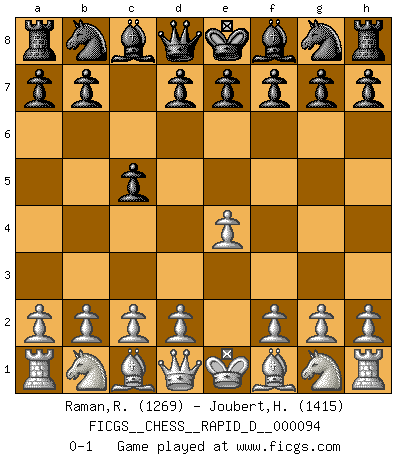 Last move : 0-1 2015 October 8 0:18:41 [Event "FICGS__CHESS__RAPID_D__000094"] [Site "FICGS"] [Date "2015.09.06"] [Round "1"] [White "Raman,Ranganathan"] [Black "Joubert,Hennie"] [Result "0-1"] [WhiteElo "1269"] [BlackElo "1415"] 1.e4 c5 0-1 This chess game has been lost on time (started : 2015.09.06 8:37:2) Sicilian defense Player Black won this chess game. Follow this game move after move (download)The enormous mental resilience, without which no Chess player can exist, was so much taken up by Chess that he could never free his mind of this game. (Albert Einstein) Dieses schreckliche Gefühl, dass ich gegen eine Maschine spielte, die niemals Fehler macht, zerschmetterte meinen Widerstand. (Mark Taimanov) Evita las multitudes. Haz independientemente tu propio razonamiento. Trata de ser el jugador de Ajedrez, no la pieza de Ajedrez. (Ralph Charell) Ne tendez aucun piège pour le plaisir ! Ne jouez rien dans l'espoir que l'adversaire réagisse de façon stupide ! Prenez toujours pour acquis que l'adversaire va trouver le meilleur coup ! Ne jouez jamais de coup dans l'espoir que l'adversaire ne voie pas la menace ! Chacun de vos coups doit améliorer la position d'une façon ou d'une autre. However beautiful the strategy, you should occasionally look at the results. (Winston Churchill)