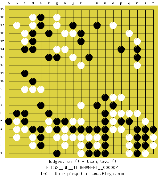 Last move : 1-0 2006 September 13 12:0:9 [Event "FICGS__GO__TOURNAMENT__000002 "] [Site "FICGS"] [Date "2006.05.30"] [Round "1"] [Black "Hodges,Tom "] [White "Usan,Kavi "] [Result "1-0"] 1.r4 c16 2.e17 g17 3.d15 d18 4.e18 d17 5.d16 c15 6.f16 h16 7.c14 b17 8.d14 q16 9.c5 d3 10.e4 c4 11.e3 b5 12.c6 b3 13.b6 c9 14.c11 e9 15.d10 d9 16.d4 d2 17.a5 b4 18.e7 p4 19.n3 q3 20.n5 g3 21.e2 k3 22.l4 k5 23.k4 j3 24.j4 h4 25.h5 o5 26.n6 k7 27.g4 m2 28.n2 m3 29.m4 h3 30.g1 h2 31.l2 l3 32.m1 k2 33.l1 k1 34.n1 f4 35.g5 f5 36.f6 r6 37.r3 s5 38.s4 q2 39.q5 q6 40.p5 o4 41.n4 p6 42.r2 o6 43.s2 t3 44.r1 j5 45.n8 q1 46.t4 t2 47.t1 s1 48.s3 n7 49.m7 o8 50.o7 p8 51.j17 g18 52.m17 o17 53.k15 j16 54.k16 h14 55.g13 g14 56.f13 j13 57.l13 k12 58.r14 r12 59.p14 r15 60.r13 1-0 Here are the names of the openings (joseki) played in the four corners : Corner d16 : c16 e17Komoku (Somok, Xiao~mu`) 3-4 Point. The komoku (3-4) point is the traditional corner enclosure move..Ikken Kakari (Hankan Keolch'im, Yi Gua`jiao~, 1-Space Low Pincer). The small knight move is the basic approach move to the 3-4 point stone. It has been continually used for over four centuries. There are limitless variations, with new moves constantly being discovered. Black 2 opens the door to a treaure store of joseki. Corner d4 : c5 d3Mokuhazushi (Waemok, Wai`mu`) 5-3 Point. The mokuhazushi (5-3) point was popular in the Edo period in Japan (1600 - 1867). It emphasizes influence; territorially, it is inferior to the 3-4 point.Komoku Kakari. White 2 is the standard approach because of its solidity and stability. Corner q4 : r4 p4Komoku (Somok, Xiao~mu`) 3-4 Point. The komoku (3-4) point is the traditional corner enclosure move..Ikken Takagakari (Hankan Nop'dakeolch'im, Yi Gaogua`jiao~, 1-Space High Approach). The 5-4 approach move has become more popular in modern times, as modern Go emphasizes speed and influence. Corner q16 : q16 m17Hoshi (Hwajeom, Seongjeom, Xingwei`) 4-4 Point. The star or hoshi (4-4) point, emphasizing influence at the potential expense of territory. Player Black won this Go (weiqi, baduk) game.Follow this game move after move (download ) Territory is a closed space where time no longer exists. The transformation around it slower alter it, and sometimes it cracks open like a rotten egg at the least shock. (Pierre Audouard) Being number two sucks. (Andre Agassi)