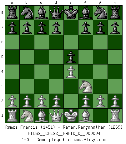 Last move : 1-0 2015 October 10 0:43:39 [Event "FICGS__CHESS__RAPID_D__000094"] [Site "FICGS"] [Date "2015.09.06"] [Round "1"] [White "Ramos,Francis"] [Black "Raman,Ranganathan"] [Result "1-0"] [WhiteElo "1451"] [BlackElo "1269"] 1.e4 e5 2.Nf3 1-0 This chess game has been lost on time (started : 2015.09.06 8:37:2) King's knight Opening Player White won this chess game. Follow this game move after move (download)In blitz, the Knight is stronger than the Bishop. (Vlastimil Hort) Ich glaube nicht an Psychologie, ich glaube an gute Züge. (Robert James Fischer) A través de las casillas del tablero, los Indios explican el movimiento del tiempo y la edad, las influencias mas altas que controlan el mundo y los lazos que vinculan al Ajedrez con el alma humana. (Al-Masudi) Le système Elo représente seulement une moyenne. Il est simplement un indicateur de votre stabilité. (Anatoli Karpov) The right perception of any matter and a misunderstanding of the same matter do not wholly exclude each other. (Kafka's the trial)