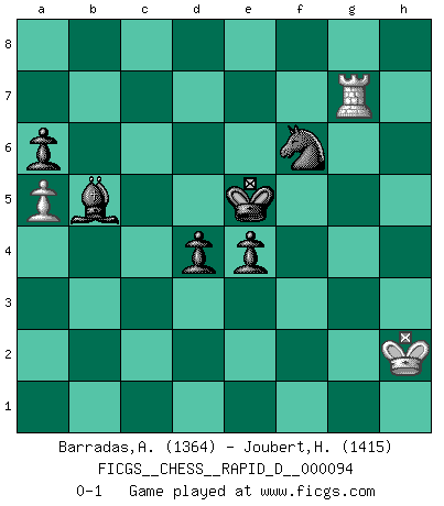 Last move : 0-1 2015 October 7 23:37:31 [Event "FICGS__CHESS__RAPID_D__000094"] [Site "FICGS"] [Date "2015.09.06"] [Round "1"] [White "Barradas,Anderson"] [Black "Joubert,Hennie"] [Result "0-1"] [WhiteElo "1364"] [BlackElo "1415"] 1.e4 c5 2.Nf3 e6 3.d4 cxd4 4.Nxd4 Nf6 5.Nc3 Qb6 6.a3 Bc5 7.Be3 Nc6 8.Nxc6 Bxe3 9.fxe3 Qxe3+ 10.Qe2 Qxe2+ 11.Bxe2 bxc6 12.O-O d5 13.exd5 cxd5 14.Bf3 Rb8 15.b4 Ba6 16.Rfe1 O-O 17.b5 Bxb5 18.g4 h6 19.h4 Ba6 20.Na4 Rfc8 21.c3 Rb3 22.g5 hxg5 23.hxg5 Nd7 24.g6 Bb5 25.Bd1 Bxa4 26.Bxb3 Bxb3 27.gxf7+ Kxf7 28.Rf1+ Ke7 29.Rf4 Rxc3 30.a4 e5 31.Rb4 Bc4 32.a5 a6 33.Re1 Kd6 34.Kf2 e4 35.R4b1 Rf3+ 36.Kg2 Bd3 37.Rg1 Bb5 38.Kh2 Rf7 39.Rg6+ Ke5 40.Rbg1 Nf6 41.Rxg7 Rxg7 42.Rxg7 d4 0-1 Sicilian : Anderssen variation Kingside Castling by player White (move 12) Kingside Castling by player Black (move 16) 10 pieces endgame at move 41 : White KRP , Black KRBNPPP WHITE : King + 1 Rook 1 Pawn BLACK : King + 1 Rook 1 Bishop 1 Knight 3 Pawns 9 pieces endgame at move 42 : White KRP , Black KBNPPP WHITE : King + 1 Rook 1 Pawn BLACK : King + 1 Bishop 1 Knight 3 Pawns Player Black won this chess game. Follow this game move after move (download)Discovered check is the dive bomber of the Chessboard. (Reuben Fine) Ich war zu klein für die Schach-Schülermannschaft! (Woody Allen) Yo creo que el Ajedrez posee una magia que es también una ayuda en la edad avanzada. Una rodilla reumática es olvidada durante una partida de Ajedrez y otros eventos pueden parecer algo sin importancia comparada a una catástrofe en el tablero de Ajedrez. (Vlastimil Hort) Vous savez, camarade Pachman, je n'éprouve pas de plaisir à être ministre, je jouerais plutôt aux échecs comme vous, ou alors ferais une révolution au Venezuela. (Che Guevara à Ludek Pachman, 'Checkmate in Prague', 1975) You can think I'm wrong, but that's no reason to quit thinking. (Gregory House, House M.D.)