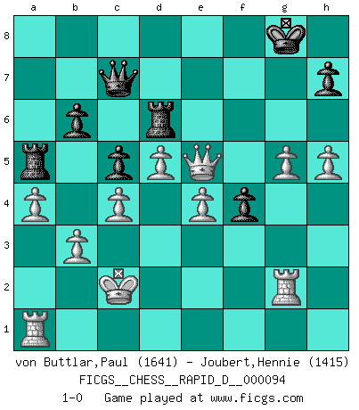 Last move : 1-0 2015 December 29 15:11:27 [Event "FICGS__CHESS__RAPID_D__000094"] [Site "FICGS"] [Date "2015.09.06"] [Round "1"] [White "von Buttlar,Paul"] [Black "Joubert,Hennie"] [Result "1-0"] [WhiteElo "1641"] [BlackElo "1415"] 1.c4 Nf6 2.Nc3 g6 3.e4 d6 4.d4 Bg7 5.f3 O-O 6.Be3 Nbd7 7.Bd3 e5 8.d5 Nc5 9.Bc2 a5 10.Qd2 Re8 11.Nge2 Nh5 12.g4 Nf6 13.h4 a4 14.Ng3 Bd7 15.g5 Nh5 16.Nxh5 gxh5 17.Ne2 f6 18.Ng3 Rf8 19.Nxh5 Qe7 20.O-O-O f5 21.Nxg7 Qxg7 22.Rdg1 f4 23.Bxc5 dxc5 24.h5 b6 25.a3 Rad8 26.Kb1 Bc8 27.Bxa4 Bd7 28.Bc2 c6 29.Qc3 cxd5 30.exd5 Bf5 31.Be4 Bxe4+ 32.fxe4 Rd6 33.Rf1 Re8 34.a4 Qa7 35.b3 Qa5 36.Qb2 Qb4 37.Rhg1 Qa5 38.Rf3 Qb4 39.Qg2 Qa5 40.Qh3 Qa7 41.Qf5 Qe7 42.Kc2 Rf8 43.Qg4 Re8 44.Ra1 Ra8 45.Rf2 Qd8 46.Qg1 Qe7 47.Rg2 Ra5 48.Qe1 Qd8 49.Qc3 Qc7 50.Qxe5 1-0 English Opening Kingside Castling by player Black (move 5) Queenside Castling by player White (move 20) Player White won this chess game. Follow this game move after move (download)When you don't know what to do, wait for your opponent to get an idea - it's sure to be wrong. (Tarrasch) Wenn ich mich einlogge, glauben die Leute gewöhnlich nicht, dass ich es selbst bin und sie fangen an, mir dumme Fragen zu stellen. Und wenn sie es glauben, stellen sie wieder andere dumme Fragen. (Judith Polgar) Fischer es el jugador mas fuerte del mundo. De hecho, el jugador mas fuerte que jamas haya existido. (Larry Evans) La victoire dans une partie d'Echecs appartient la plupart du temps à celui qui voit un peu plus loin que l'adversaire. (Lasker) Fear is the path to the dark side. Fear leads to anger; anger leads to hate; hate leads to suffering. I sense much fear in you. (Master Yoda in Star Wars ep.1)