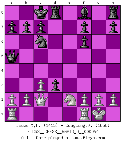 Last move : 0-1 2015 October 5 6:17:19 [Event "FICGS__CHESS__RAPID_D__000094"] [Site "FICGS"] [Date "2015.09.06"] [Round "1"] [White "Joubert,Hennie"] [Black "Cuaycong,Virgilio"] [Result "0-1"] [WhiteElo "1415"] [BlackElo "1656"] 1.e4 d5 2.exd5 Qxd5 3.Nc3 Qa5 4.d4 Nf6 5.Nf3 Bg4 6.Be2 Nc6 7.Be3 O-O-O 8.O-O e5 9.Bg5 Bxf3 10.Bxf6 Bxe2 11.Nxe2 gxf6 12.c3 exd4 13.Qc2 d3 0-1 Scandinavian (centre counter) defense Queenside Castling by player Black (move 7) Kingside Castling by player White (move 8) Player Black won this chess game. Follow this game move after move (download)Fischer is the strongest player in the world. In fact, the strongest player who ever lived. (Larry Evans) Gewöhnliche Menschen denken nur daran, wie sie ihre Zeit verbringen. Ein intelligenter Mensch versucht, sie auszunutzen. (Arthur Schopenhauer) En un gambito tu regalas un Peón por el bién de tomar un juego perdido. (Samuel Standige Boden) Je menace de comprendre la position. (Anonyme) Perhaps the current trend of many chess professionals taking up the more lucrative pastime of poker is not a wholly negative one. It may not be too late for humans to relearn how to take risks in order to innovate and thereby maintain the advanced lifestyles we enjoy. And if it takes a poker-playing supercomputer to remind us that we can't enjoy the rewards without taking the risks, so be it. (The Chess Master and the Computer, by Garry Kasparov - 2010)