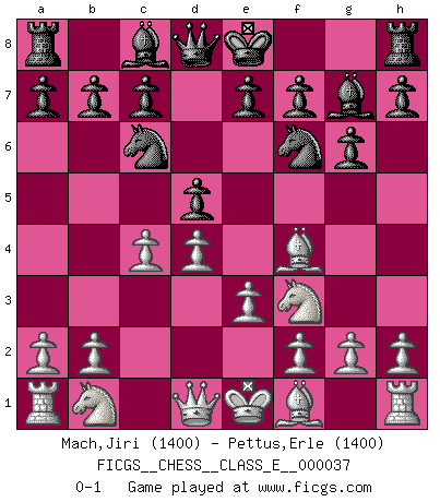 Last move : 0-1 2007 May 10 2:30:12 [Event "FICGS__CHESS__CLASS_E__000037"] [Site "FICGS"] [Date "2007.03.09"] [Round "1"] [White "Mach,Jiri"] [Black "Pettus,Erle"] [Result "0-1"] [WhiteElo "1400"] [BlackElo "1400"] 1.d4 d5 2.Nf3 Nc6 3.Bf4 g6 4.e3 Bg7 5.c4 Nf6 0-1 This chess game has been lost on time (started : 2007.03.09 21:47:23) Queen's pawn game, Chigorin variation Player Black won this chess game. Follow this game move after move (download)I thought the most common mistake [in chess] was the first one: Learning the game :P (Garvin Gray, FICGS forum) Wie, soll nun auch die Opposition abgeschafft werden? Ja, es tut mir leid, Ihnen diesen Schmerz nicht ersparen zu können. (Aaron Nimzowitsch) El Ajedrez es un cuento de Hadas de las 1001 metidas de pata. (Savielly Tartakower) La menace est plus forte que l'exécution. (Aaron Nimzovitch) In God we trust, all others we virus scan. (Anonymous)
