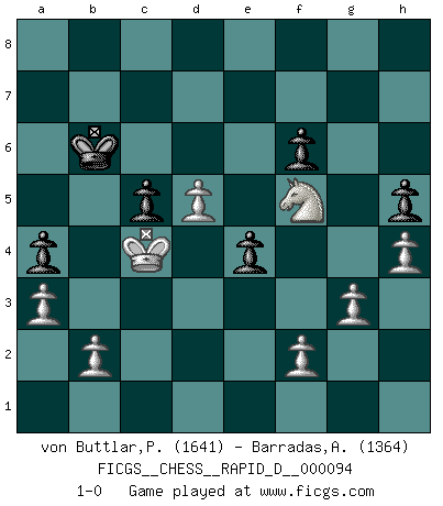 Last move : 1-0 2015 September 19 14:21:47 [Event "FICGS__CHESS__RAPID_D__000094"] [Site "FICGS"] [Date "2015.09.06"] [Round "1"] [White "von Buttlar,Paul"] [Black "Barradas,Anderson"] [Result "1-0"] [WhiteElo "1641"] [BlackElo "1364"] 1.c4 Nf6 2.Nc3 e6 3.e4 Bb4 4.e5 Ng8 5.d4 d6 6.exd6 cxd6 7.Qa4+ Nc6 8.d5 Qa5 9.Qxa5 Bxa5 10.dxc6 bxc6 11.Bd2 Nf6 12.O-O-O Bxc3 13.Bxc3 O-O 14.Bxf6 gxf6 15.Rxd6 Bb7 16.Nf3 c5 17.Be2 Rab8 18.Rhd1 Rbc8 19.Rd7 Rb8 20.Rc7 Rfc8 21.R1d7 Rxc7 22.Rxc7 e5 23.Nh4 a5 24.Bf3 e4 25.Bh5 Ba8 26.Bxf7+ Kf8 27.g3 Rb7 28.Rxb7 Bxb7 29.Bd5 Bxd5 30.cxd5 Ke7 31.Nf5+ Kd7 32.Kd2 a4 33.Kc3 Kc7 34.Kc4 Kb6 35.a3 h5 36.h4 1-0 English : Mikenas-Carls variation Queenside Castling by player White (move 12) Kingside Castling by player Black (move 13) Player White won this chess game. Follow this game move after move (download)In the perfect Chess combination as in a first-rate short story, the whole plot and counter-plot should lead up to a striking finale, the interest not being allayed until the very last moment. (Yates and Winter) Wenn man heute mit 14 Jahren noch kein GM ist, kann man es vergessen. (Viswanathan Anand) A través de las casillas del tablero, los Indios explican el movimiento del tiempo y la edad, las influencias mas altas que controlan el mundo y los lazos que vinculan al Ajedrez con el alma humana. (Al-Masudi) Il a essayé de se convaincre qu'il pourrait empêcher toutes les erreurs et ne jamais perdre. L'horreur ! Gary Kasparov au sujet de Robert Fischer. Good decisions come from experience, and experience comes from bad decisions. (Anonymous)