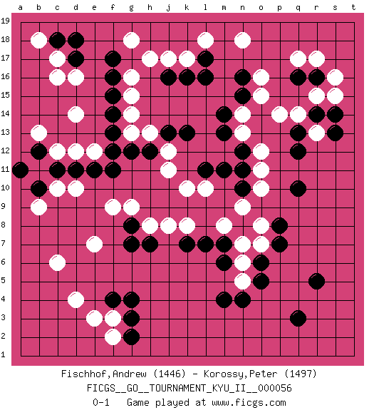 Last move : 0-1 2016 February 22 9:42:19 [Event "FICGS__GO__TOURNAMENT_KYU_II__000056"] [Site "FICGS"] [Date "2015.09.06"] [Round "1"] [Black "Fischhof,Andrew"] [White "Korossy,Peter"] [Result "0-1"] [Rating 1 "1446"] [Rating 2 "1497"] 1.q16 d4 2.q3 d16 3.r5 d10 4.f17 h17 5.f15 d14 6.j16 j17 7.k16 k17 8.l16 g16 9.f16 g15 10.f14 g14 11.f13 g13 12.f11 n18 13.l17 l18 14.n16 r17 15.r16 q17 16.q10 k10 17.f4 f3 18.g3 e3 19.g4 c6 20.d18 c17 21.c18 b18 22.g12 e12 23.f12 j12 24.e11 d12 25.d11 c10 26.h12 h13 27.j13 j11 28.c11 c12 29.b12 b13 30.b10 b9 31.a11 f9 32.m4 n14 33.k13 o16 34.n15 o15 35.m14 n13 36.m13 r13 37.q13 q14 38.r14 p14 39.q12 r15 40.s14 s15 41.s13 s16 42.g7 h8 43.h7 m8 44.l7 o8 45.p7 o7 46.o6 o11 47.p8 n6 48.o5 n5 49.n4 e7 50.n12 o12 51.n11 o10 52.n10 n9 53.l11 l10 54.m11 k8 55.k7 j8 56.g8 g9 57.g2 f2 58.m6 n7 59.m7 g18 60.d17 c16 0-1 Here are the names of the openings (joseki) played in the four corners : Corner d16 : d16 f17 Hoshi (Hwajeom, Seongjeom, Xingwei`) 4-4 Point. The star or hoshi (4-4) point, emphasizing influence at the potential expense of territory. Ikken Kakari (Hankan Keolch'im, Yi Gua`jiao~, 1-Space Low Approach). Black 2 is the standard approach move to the 4-4. Corner d4 : d4 f4 Hoshi (Hwajeom, Seongjeom, Xingwei`) 4-4 Point. The star or hoshi (4-4) point, emphasizing influence at the potential expense of territory. Ikken Takagakari (Hankan Nop'dakeolch'im, Yi Gaojia, 1-Space High Approach). White typically responds at 6-4 or 3-10. White 4-10 is played when White finds play on the right side advantageous. White 4-8 or 3-8 may be played when White has support at top. Player White won this Go (weiqi, baduk) game. Follow this game move after move (download)The comb formation is alive. (Anonymous) Now you put water in a cup, it becomes the cup; You put water into a bottle it becomes the bottle; You put it in a teapot it becomes the teapot. Water can flow or it can crash. Be water, my friend. (Bruce Lee)