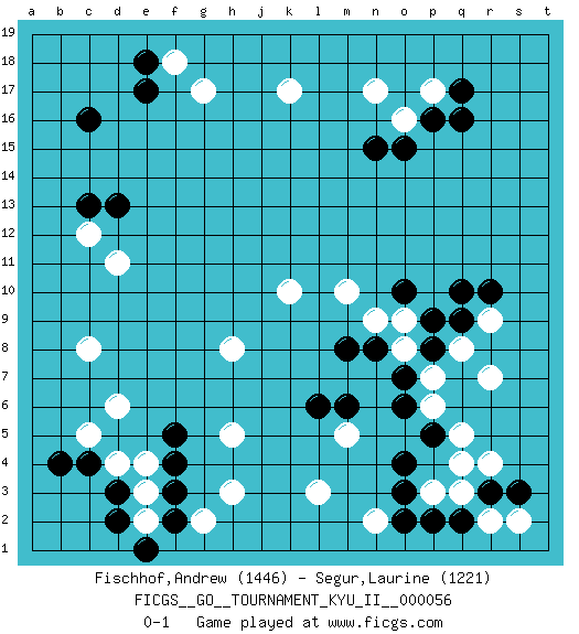 Last move : 0-1 2016 February 21 8:21:21 [Event "FICGS__GO__TOURNAMENT_KYU_II__000056"] [Site "FICGS"] [Date "2015.09.06"] [Round "1"] [Black "Fischhof,Andrew"] [White "Segur,Laurine"] [Result "0-1"] [Rating 1 "1446"] [Rating 2 "1221"] 1.q16 q4 2.c16 d4 3.e17 c8 4.f3 e3 5.f4 d11 6.o3 p3 7.o4 r7 8.q10 r9 9.r10 p17 10.q17 n17 11.p16 o16 12.o15 k17 13.n15 g17 14.d13 h3 15.f2 l3 16.d2 e2 17.e1 d6 18.d3 e4 19.f5 g2 20.c4 c5 21.b4 c12 22.c13 f18 23.e18 h5 24.q9 q8 25.r3 r4 26.p2 q3 27.q2 r2 28.p8 p7 29.o7 p6 30.o6 o8 31.p9 n9 32.n8 o9 33.m8 m10 34.o10 k10 35.l6 n2 36.o2 m5 37.m6 h8 38.p5 q5 39.s3 s2 0-1 Here are the names of the openings (joseki) played in the four corners : Corner q4 : q4 o3 Hoshi (Hwajeom, Seongjeom, Xingwei`) 4-4 Point. The star or hoshi (4-4) point, emphasizing influence at the potential expense of territory. Ikken Kakari (Hankan Keolch'im, Yi Gua`jiao~, 1-Space Low Approach). Black 2 is the standard approach move to the 4-4. Corner q16 : q16 p17 Hoshi (Hwajeom, Seongjeom, Xingwei`) 4-4 Point. The star or hoshi (4-4) point, emphasizing influence at the potential expense of territory. Player White won this Go (weiqi, baduk) game. Follow this game move after move (download)Go is not a blocking game, it's a game of action. (Pierre Audouard) All the troubles of the world come from being unable to sit alone in a quiet room. (Blaise Pascal)