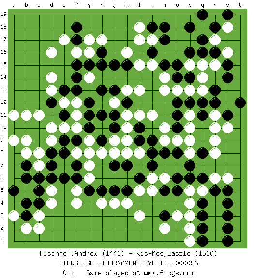 Last move : 0-1 2016 February 21 8:20:52 [Event "FICGS__GO__TOURNAMENT_KYU_II__000056"] [Site "FICGS"] [Date "2015.09.06"] [Round "1"] [Black "Fischhof,Andrew"] [White "Kis-Kos,Laszlo"] [Result "0-1"] [Rating 1 "1446"] [Rating 2 "1560"] 1.q16 d4 2.q3 d16 3.r5 l3 4.c6 c8 5.e6 f4 6.b4 c3 7.b3 d10 8.f17 h17 9.f15 d14 10.f13 l17 11.n17 l15 12.n15 f10 13.d12 e17 14.f18 e12 15.e13 d13 16.e11 f12 17.g12 f11 18.h13 g14 19.f14 j12 20.h15 g16 21.g15 f16 22.h16 g17 23.j13 l13 24.k12 r11 25.r13 r8 26.j11 o3 27.q12 p5 28.q6 r4 29.q4 q5 30.s4 r6 31.s5 s6 32.q11 r10 33.p7 r2 34.q2 g6 35.e9 e10 36.d8 c7 37.d7 d9 38.g8 f8 39.f7 g7 40.f9 g9 41.e8 h8 42.b7 b8 43.b6 p10 44.o11 r17 45.q17 s16 46.s15 r15 47.s14 q18 48.p18 s18 49.q19 r19 50.r18 d5 51.d6 q18 52.c9 b9 53.r18 r3 54.s3 q18 55.c10 c11 56.r18 p2 57.s2 q18 58.b10 b11 59.r18 r1 60.q1 q18 61.a10 a11 62.r18 n13 63.s19 p11 64.o12 p13 65.p12 n14 66.o14 o13 67.p14 q13 68.r12 q14 69.r16 p15 70.o15 q15 71.p16 m11 72.o10 p9 73.o8 o9 74.n8 n9 75.m8 k10 76.g10 f8 77.g11 a9 78.h9 g8 79.f6 j9 80.o5 p4 81.n5 l5 82.m9 n10 83.s11 s10 84.t12 h10 85.h11 b2 86.c4 c2 87.c5 f5 88.k7 m6 89.m7 n6 90.o6 p3 91.s1 p8 92.l6 m5 93.k5 k4 94.j5 j4 95.h5 h4 96.j7 l8 97.l9 k8 98.l10 l11 99.g5 k11 100.q8 r9 101.j10 k9 102.h9 j8 103.p6 k13 104.k15 k16 105.j15 m15 106.m16 m17 107.m18 l18 108.n18 a3 109.a5 p1 110.n3 n2 0-1 Here are the names of the openings (joseki) played in the four corners : Corner d4 : d4 c6 Hoshi (Hwajeom, Seongjeom, Xingwei`) 4-4 Point. The star or hoshi (4-4) point, emphasizing influence at the potential expense of territory. Ikken Kakari (Hankan Keolch'im, Yi Gua`jiao~, 1-Space Low Approach). Black 2 is the standard approach move to the 4-4. Corner d16 : d16 f17 Hoshi (Hwajeom, Seongjeom, Xingwei`) 4-4 Point. The star or hoshi (4-4) point, emphasizing influence at the potential expense of territory. Ikken Kakari (Hankan Keolch'im, Yi Gua`jiao~, 1-Space Low Approach). Black 2 is the standard approach move to the 4-4. Corner q16 : q16 l17 Hoshi (Hwajeom, Seongjeom, Xingwei`) 4-4 Point. The star or hoshi (4-4) point, emphasizing influence at the potential expense of territory. Player White won this Go (weiqi, baduk) game. Follow this game move after move (download)Five liberties for tactical stability. (Anonymous) I'm extremely disappointed. I send you out for exciting, new designer drugs, you come back with tomato sauce. (Gregory House, House M.D.)