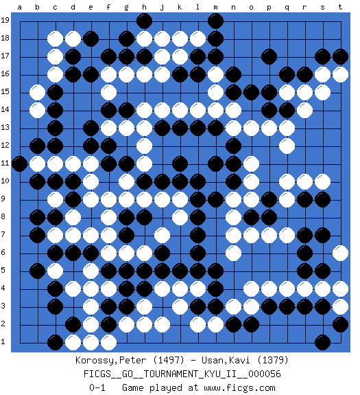 Last move : 0-1 2016 March 29 12:55:28 [Event "FICGS__GO__TOURNAMENT_KYU_II__000056"] [Site "FICGS"] [Date "2015.09.06"] [Round "1"] [Black "Korossy,Peter"] [White "Usan,Kavi"] [Result "0-1"] [Rating 1 "1497"] [Rating 2 "1379"] 1.q16 d4 2.d16 q4 3.k16 k4 4.r6 q10 5.r3 r4 6.q3 p4 7.p3 o3 8.o2 n3 9.n2 m2 10.d10 r14 11.q14 r15 12.r16 q15 13.p15 q13 14.p14 q12 15.c6 c5 16.d6 f4 17.m3 l2 18.m4 o4 19.m5 p7 20.r9 r10 21.s9 s10 22.p8 o7 23.o8 n7 24.l6 n8 25.s5 s4 26.s3 t3 27.t2 t4 28.s1 o9 29.p9 o10 30.s7 q7 31.r7 q9 32.r5 t6 33.j6 f6 34.g7 f7 35.g8 f8 36.h10 d8 37.c8 f9 38.e12 c17 39.d17 c16 40.c15 b15 41.c14 b14 42.c13 k17 43.l17 j17 44.g17 j16 45.l16 g16 46.h17 h16 47.f17 j14 48.g14 h14 49.k13 k14 50.l13 g13 51.f14 h12 52.j13 h13 53.g11 l14 54.m13 m14 55.n15 n13 56.k11 n14 57.m9 m10 58.l9 n9 59.n12 o13 60.h4 h3 61.j3 j4 62.g3 h2 63.g4 g2 64.f3 e4 65.f2 j2 66.c3 e2 67.b5 c9 68.c4 e3 69.g5 f1 70.f5 e5 71.e6 g6 72.h5 h6 73.j5 j7 74.k5 l4 75.l7 k8 76.l8 g9 77.d9 k9 78.l10 h9 79.k10 h11 80.j10 g10 81.f11 j9 82.h8 c7 83.b8 e10 84.m11 e11 85.f12 d11 86.c10 c11 87.b12 b11 88.c12 d7 89.b7 e9 90.b10 e7 91.n10 o11 92.n11 m15 93.n16 s16 94.s17 s15 95.t17 t16 96.p17 l18 97.m18 k18 98.m19 m16 99.m17 h18 100.g18 f16 101.e16 d18 102.e18 c18 103.h19 j18 104.a11 n6 105.d2 d1 106.c1 e1 107.l3 k3 108.l5 p13 109.o15 f13 110.e13 f15 0-1 Here are the names of the openings (joseki) played in the four corners : Corner q4 : q4 r6 Hoshi (Hwajeom, Seongjeom, Xingwei`) 4-4 Point. The star or hoshi (4-4) point, emphasizing influence at the potential expense of territory. Ikken Kakari (Hankan Keolch'im, Yi Gua`jiao~, 1-Space Low Approach). Black 2 is the standard approach move to the 4-4. Corner q16 : q16 r14 Hoshi (Hwajeom, Seongjeom, Xingwei`) 4-4 Point. The star or hoshi (4-4) point, emphasizing influence at the potential expense of territory. Ikken Kakari (Hankan Keolch'im, Yi Gua`jiao~, 1-Space Low Approach). White 2 is the standard approach move to the 4-4. Corner d4 : d4 c6 Hoshi (Hwajeom, Seongjeom, Xingwei`) 4-4 Point. The star or hoshi (4-4) point, emphasizing influence at the potential expense of territory. Ikken Kakari (Hankan Keolch'im, Yi Gua`jiao~, 1-Space Low Approach). Black 2 is the standard approach move to the 4-4. Player White won this Go (weiqi, baduk) game. Follow this game move after move (download)In the sound of the stone you can hear its purpose. (Pierre Audouard) I feel so... helpless. (C-3PO in Star Wars ep.3)