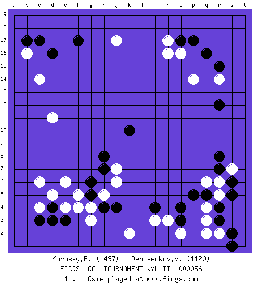 Last move : 1-0 2015 December 8 8:20:26 [Event "FICGS__GO__TOURNAMENT_KYU_II__000056 "] [Site "FICGS"] [Date "2015.09.06"] [Round "1"] [Black "Korossy,Peter "] [White "Denisenkov,Valentin "] [Result "1-0"] [Rating 1 "1497"] [Rating 2 "1120"] 1.q16 c4 2.e3 g3 3.e5 c6 4.h4 g4 5.g5 h5 6.j4 f5 7.g6 e4 8.d4 f4 9.c3 d5 10.d3 e6 11.d16 q4 12.o3 m3 13.r3 q3 14.r4 r5 15.s5 r6 16.s6 s7 17.q5 q6 18.p5 r2 19.s2 q2 20.s1 o2 21.m4 n3 22.o4 k2 23.r7 c14 24.f17 b16 25.c17 r14 26.r12 p14 27.r8 o16 28.o17 n17 29.p17 n16 30.r15 j17 31.b17 d11 32.k10 j6 33.h7 j7 34.h8 1-0 This go game has been lost on time (started : 2015.09.06 23:27:35) Here are the names of the openings (joseki) played in the four corners : Corner d4 : c4 e3Komoku (Somok, Xiao~mu`) 3-4 Point. The komoku (3-4) point is the traditional corner enclosure move..Ikken Kakari (Hankan Keolch'im, Yi Gua`jiao~, 1-Space Low Pincer). The small knight move is the basic approach move to the 3-4 point stone. It has been continually used for over four centuries. There are limitless variations, with new moves constantly being discovered. Black 2 opens the door to a treaure store of joseki. Corner q4 : q4 o3Hoshi (Hwajeom, Seongjeom, Xingwei`) 4-4 Point. The star or hoshi (4-4) point, emphasizing influence at the potential expense of territory.Ikken Kakari (Hankan Keolch'im, Yi Gua`jiao~, 1-Space Low Approach). Black 2 is the standard approach move to the 4-4. Corner d16 : d16 c14Hoshi (Hwajeom, Seongjeom, Xingwei`) 4-4 Point. The star or hoshi (4-4) point, emphasizing influence at the potential expense of territory.Ikken Kakari (Hankan Keolch'im, Yi Gua`jiao~, 1-Space Low Approach). White 2 is the standard approach move to the 4-4. Corner q16 : q16 r14Hoshi (Hwajeom, Seongjeom, Xingwei`) 4-4 Point. The star or hoshi (4-4) point, emphasizing influence at the potential expense of territory.Ikken Kakari (Hankan Keolch'im, Yi Gua`jiao~, 1-Space Low Approach). White 2 is the standard approach move to the 4-4. Player Black won this Go (weiqi, baduk) game.Follow this game move after move (download ) In opponents' sphere of influence, avoid sharp conflict, don't move too deep. (Otake Hideo, 9p) Hello Thibault, if I have had a plan (and I had one, I hope), I have forgotten it during the last week... - Hello Heinz-Georg. What do you mean a plan ? (Anonymous players, during a Big Chess game)