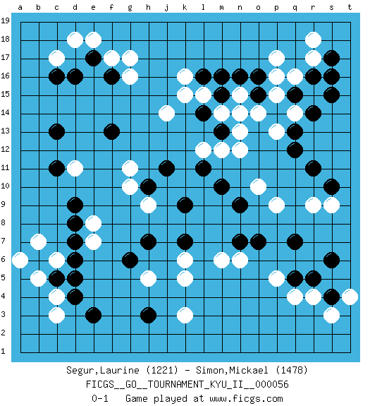 Last move : 0-1 2015 December 15 18:53:0 [Event "FICGS__GO__TOURNAMENT_KYU_II__000056"] [Site "FICGS"] [Date "2015.09.06"] [Round "1"] [Black "Segur,Laurine"] [White "Simon,Mickael"] [Result "0-1"] [Rating 1 "1221"] [Rating 2 "1478"] 1.d4 q16 2.d16 q4 3.h3 f17 4.c13 d18 5.e17 e18 6.f16 g17 7.d9 k3 8.m16 k5 9.r14 g16 10.f13 h5 11.r11 r9 12.r16 r17 13.s16 p17 14.s17 r18 15.q15 p15 16.o16 p16 17.n14 p13 18.p14 o14 19.q13 q14 20.q12 r15 21.s15 c17 22.c16 k16 23.l14 j14 24.o15 n13 25.m13 n12 26.s10 s9 27.q15 n15 28.m15 m14 29.n16 n14 30.p14 l15 31.l16 k15 32.r5 r4 33.q5 p5 34.s4 s3 35.s6 t4 36.q7 p9 37.o7 n6 38.n7 m6 39.n9 o10 40.m10 m12 41.k9 h9 42.k7 k6 43.l11 l12 44.j11 g11 45.h10 g10 46.h7 e8 47.d8 e7 48.d7 d11 49.c11 q14 50.g6 c3 51.e3 c4 52.c5 b5 53.b6 c6 54.d5 b7 55.d6 a6 0-1 Here are the names of the openings (joseki) played in the four corners : Corner d16 : d16 f17 Hoshi (Hwajeom, Seongjeom, Xingwei`) 4-4 Point. The star or hoshi (4-4) point, emphasizing influence at the potential expense of territory. Ikken Kakari (Hankan Keolch'im, Yi Gua`jiao~, 1-Space Low Approach). White 2 is the standard approach move to the 4-4. Corner q16 : q16 m16 Hoshi (Hwajeom, Seongjeom, Xingwei`) 4-4 Point. The star or hoshi (4-4) point, emphasizing influence at the potential expense of territory. Player White won this Go (weiqi, baduk) game. Follow this game move after move (download)Keep sente in the opening. A premature attack loses sente. (Anonymous) May the force be with you. (Han Solo in Star Wars ep.4)