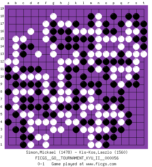 Last move : 0-1 2015 October 26 16:25:15 [Event "FICGS__GO__TOURNAMENT_KYU_II__000056"] [Site "FICGS"] [Date "2015.09.06"] [Round "1"] [Black "Simon,Mickael"] [White "Kis-Kos,Laszlo"] [Result "0-1"] [Rating 1 "1478"] [Rating 2 "1560"] 1.r4 d16 2.q17 d4 3.p3 q15 4.p16 r17 5.r18 r16 6.p18 r11 7.c14 f17 8.f3 h3 9.c3 d3 10.c4 d5 11.d2 e2 12.c2 f2 13.c6 l3 14.r9 p11 15.m17 c8 16.c7 d8 17.c11 c15 18.d14 b15 19.p9 j17 20.e11 e7 21.o14 n11 22.n9 p5 23.q6 o3 24.o2 n3 25.n2 m2 26.p4 n5 27.q13 r13 28.r14 q14 29.r12 s13 30.q12 s12 31.o12 q11 32.f5 g7 33.h6 j8 34.k7 j7 35.k6 m8 36.m9 l8 37.k8 k9 38.l9 m6 39.j9 k10 40.j6 h9 41.e3 g3 42.d6 f4 43.e6 q5 44.r5 b13 45.j10 g6 46.g5 h5 47.g8 h7 48.f7 f8 49.f6 h8 50.g9 h10 51.j11 h11 52.k11 f10 53.c13 b12 54.b10 b8 55.e9 f9 56.e8 e10 57.d9 d10 58.c9 c10 59.b9 b11 60.d11 h12 61.d7 e13 62.o11 p6 63.j14 g14 64.k3 k4 65.l4 j4 66.s10 s11 67.s17 s16 68.q7 n1 69.p2 k12 70.p12 j12 71.l10 l14 72.k15 l16 73.l15 m16 74.m15 n17 75.m18 n15 76.l13 n14 77.m14 n13 78.l12 n18 79.p14 p15 80.s18 o15 81.m4 m3 82.n12 o13 83.j16 h17 84.g15 h15 85.h14 g13 86.h16 f15 87.g16 f16 88.g17 g18 89.k17 k16 90.j15 l5 91.o4 n4 92.e1 e4 93.n8 l6 94.p7 c5 95.b5 q4 96.q3 r10 97.s9 p10 98.o10 m13 99.o7 n6 100.o6 o5 101.t16 p13 102.t14 s14 103.s15 r15 104.t15 t13 105.t17 m12 106.m11 k13 107.k14 f1 108.a11 b14 109.o16 n16 110.o1 m1 111.l7 m7 112.o17 q9 113.q8 a12 114.a10 d1 115.c1 b4 116.b3 b6 117.a4 b7 118.a8 g4 119.a6 j5 0-1 Here are the names of the openings (joseki) played in the four corners : Corner q16 : q17 q15 Komoku (Somok, Xiao~mu`) 3-4 Point. The komoku (3-4) point is the traditional corner enclosure move.. Ikken Takagakari (Hankan Nop'dakeolch'im, Yi Gaogua`jiao~, 1-Space High Approach). The 5-4 approach move has become more popular in modern times, as modern Go emphasizes speed and influence. Corner d16 : d16 c14 Hoshi (Hwajeom, Seongjeom, Xingwei`) 4-4 Point. The star or hoshi (4-4) point, emphasizing influence at the potential expense of territory. Ikken Kakari (Hankan Keolch'im, Yi Gua`jiao~, 1-Space Low Approach). Black 2 is the standard approach move to the 4-4. Corner d4 : d4 f3 Hoshi (Hwajeom, Seongjeom, Xingwei`) 4-4 Point. The star or hoshi (4-4) point, emphasizing influence at the potential expense of territory. Ikken Kakari (Hankan Keolch'im, Yi Gua`jiao~, 1-Space Low Approach). Black 2 is the standard approach move to the 4-4. Player White won this Go (weiqi, baduk) game. Follow this game move after move (download)Conservative and slow will win. Believe it ! (Anonymous) The quality of decision is like the well-timed swoop of a falcon which enables it to strike and destroy its victim. (Sun Tzu)