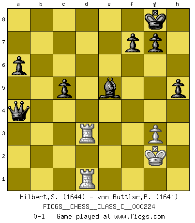 Last move : 0-1 2016 January 12 21:48:4 [Event "FICGS__CHESS__CLASS_C__000224"] [Site "FICGS"] [Date "2015.09.07"] [Round "1"] [White "Hilbert,Stephan J."] [Black "von Buttlar,Paul"] [Result "0-1"] [WhiteElo "1644"] [BlackElo "1641"] 1.b4 d5 2.Bb2 Bg4 3.Nf3 Bxf3 4.exf3 e6 5.c4 d4 6.a3 c5 7.b5 Nf6 8.g3 Nbd7 9.Bg2 Ne5 10.Qe2 Bd6 11.d3 O-O 12.f4 Ned7 13.O-O Rb8 14.Nd2 Re8 15.Ne4 Qc7 16.Rfe1 Nxe4 17.Bxe4 e5 18.f5 Nf6 19.Bg2 a6 20.a4 Qd7 21.Ba3 Qxf5 22.bxa6 bxa6 23.Bc6 Rec8 24.Bf3 Rb3 25.Be4 Nxe4 26.dxe4 Qd7 27.Qd1 Rcb8 28.Qc2 h5 29.f4 exf4 30.e5 d3 31.Qd2 Bxe5 32.Ra2 Qd4+ 33.Kg2 Rxa3 34.Rxa3 Rb2 35.Ra2 Rxd2+ 36.Rxd2 fxg3 37.hxg3 Qc3 38.Red1 Qxc4 39.Rxd3 Qxa4 0-1 Polish (Sokolsky) opening Kingside Castling by player Black (move 11) Kingside Castling by player White (move 13) Player Black won this chess game. Follow this game move after move (download)We must make sure that Chess will not be like a dead language, very interesting, but for a very small group. (Sytze Faber) Eine Person mit durchschnittlichem IQ kann etwa eine ELO von 2000 erreichen. (Jonathan Levitt) Un sacrificio se refuta mucho mejor al aceptarlo. (Wilhelm Steinitz) Des points faibles ou des trous dans la position de l'adversaire doivent être occupés par des pièces et non pas par des pions. (Siegbert Tarrasch) Winning isn't everything... but losing is nothing. (Mednis)