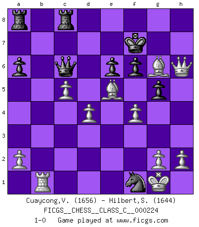 Last move : 1-0 2016 January 5 20:12:37 [Event "FICGS__CHESS__CLASS_C__000224"] [Site "FICGS"] [Date "2015.09.07"] [Round "1"] [White "Cuaycong,Virgilio"] [Black "Hilbert,Stephan J."] [Result "1-0"] [WhiteElo "1656"] [BlackElo "1644"] 1.d4 b5 2.e4 Bb7 3.Bd3 Nf6 4.Qe2 a6 5.Nf3 e6 6.O-O c5 7.c3 Be7 8.Nbd2 c4 9.Bc2 d6 10.b3 d5 11.exd5 Bxd5 12.bxc4 bxc4 13.Nxc4 O-O 14.Rb1 Nbd7 15.Nce5 Qc7 16.c4 Bxf3 17.Nxf3 Rfc8 18.Bd3 h6 19.Bd2 Bd6 20.c5 Bf4 21.Bxf4 Qc6 22.Ne5 Nxe5 23.Bxe5 Nd5 24.Qg4 g5 25.f4 Ne3 26.Qh3 Nxf1 27.Qxh6 f6 28.Bh7+ Kf7 29.Bg6+ 1-0 Polish defense Kingside Castling by player White (move 6) Kingside Castling by player Black (move 13) Player White won this chess game. Follow this game move after move (download)Some sacrifices are sound; the rest are mine. (Mikhail Tal) Fischer machte Schach einfach zu einer aufregenden Sache, wann immer er sich ans Brett setzte. (Raymond Keene) Todos los Maestros de Ajedrez fueron un día unos principiantes. (Chernev) Il a essayé de se convaincre qu'il pourrait empêcher toutes les erreurs et ne jamais perdre. L'horreur ! Gary Kasparov au sujet de Robert Fischer. He who fights with monsters should be careful lest he thereby become a monster. (Friedrich Nietzsche, Beyond Good and Evil)