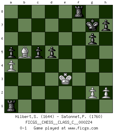 Last move : 0-1 2016 January 17 1:45:34 [Event "FICGS__CHESS__CLASS_C__000224"] [Site "FICGS"] [Date "2015.09.07"] [Round "1"] [White "Hilbert,Stephan J."] [Black "Satonnet,Patrick"] [Result "0-1"] [WhiteElo "1644"] [BlackElo "1760"] 1.b4 Nf6 2.Bb2 g6 3.c4 Bg7 4.Nf3 O-O 5.e3 d6 6.d3 e5 7.Nbd2 Nbd7 8.Be2 Qe7 9.O-O a5 10.b5 b6 11.a4 Bb7 12.Nb3 e4 13.Nfd4 exd3 14.Bxd3 Ne4 15.Nc6 Bxc6 16.Bxg7 Kxg7 17.bxc6 Ndc5 18.Nxc5 Nxc5 19.Ra3 Rae8 20.Bc2 f5 21.Qd4+ Qf6 22.Qxf6+ Rxf6 23.Rd1 Rfe6 24.R3a1 Re5 25.Rd4 Ne6 26.Rd2 Nd8 27.Rad1 f4 28.Kf1 fxe3 29.fxe3 Rxe3 30.Kf2 Nxc6 31.Bd3 Nb4 32.Bf1 Ra3 33.c5 bxc5 34.Kg1 d5 35.Bb5 c6 36.Rxd5 Nxd5 37.Rxd5 Ra1+ 38.Kf2 Rf8+ 39.Ke3 cxd5 0-1 Polish (Sokolsky) opening Kingside Castling by player Black (move 4) Kingside Castling by player White (move 9) Player Black won this chess game. Follow this game move after move (download)Chess is the art of analysis. (Mikhail Botvinnik) Wir irren allesamt, nur jeder irrt anders. (Georg Christoph Lichtenberg) Hay jugadores fuertes y personas amables y yo soy un jugador fuerte. (Bobby Fischer) Karpov est une pièce de musée. (Garry Kasparov) There's no money in correspondence chess. (John Knudsen)