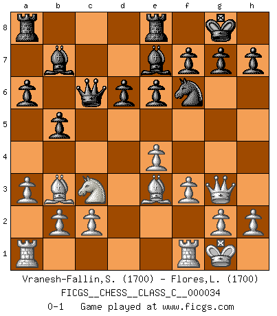 Last move : 0-1 2007 May 24 16:59:29 [Event "FICGS__CHESS__CLASS_C__000034"] [Site "FICGS"] [Date "2007.03.11"] [Round "1"] [White "Vranesh-Fallin,Scott"] [Black "Flores,Luis"] [Result "0-1"] [WhiteElo "1700"] [BlackElo "1700"] 1.e4 c5 2.Nf3 d6 3.d4 cxd4 4.Nxd4 Nf6 5.Nc3 a6 6.Bc4 e6 7.Bb3 Be7 8.Be3 b5 9.Qf3 Qc7 10.a3 Bb7 11.Qg3 Nc6 12.Nxc6 Qxc6 13.f3 O-O 14.O-O Rfe8 0-1 Sicilian : Najdorf, Lipnitzky attack Kingside Castling by player Black (move 13) Kingside Castling by player White (move 14) Player Black won this chess game. Follow this game move after move (download)Fischer is under obligation to nobody. (Joseph Platz) Je älter ich werde, um so mehr schätze ich die Bauern. (Paul Keres) Durante una competencia de Ajedrez, un Maestro de Ajedrez deberá ser una combinación de presa de caza y un Monge. (Alexander Alekhine) Si je n'étais pas joueur d'échecs, je serais le meilleur dans quelque chose d'autre. (Anatoli Karpov) You can think I'm wrong, but that's no reason to quit thinking. (Gregory House, House M.D.)