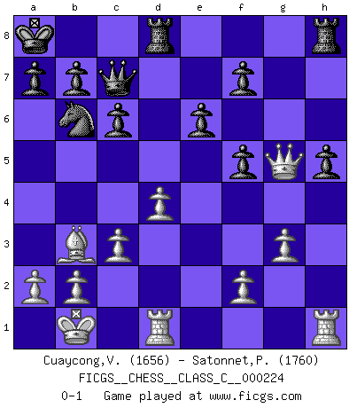 Last move : 0-1 2016 March 11 18:19:43 [Event "FICGS__CHESS__CLASS_C__000224"] [Site "FICGS"] [Date "2015.09.07"] [Round "1"] [White "Cuaycong,Virgilio"] [Black "Satonnet,Patrick"] [Result "0-1"] [WhiteElo "1656"] [BlackElo "1760"] 1.e4 d5 2.exd5 Qxd5 3.Nc3 Qa5 4.d4 Nf6 5.Nf3 Bf5 6.Bc4 e6 7.Bd2 c6 8.Nd5 Qd8 9.Nxf6+ gxf6 10.Bb3 Nd7 11.Qe2 Qc7 12.Nh4 Bg6 13.O-O-O O-O-O 14.g3 Kb8 15.Kb1 Ka8 16.Nxg6 hxg6 17.h4 Bh6 18.Bxh6 Rxh6 19.c3 f5 20.Qe3 R6h8 21.Qg5 Nb6 22.h5 gxh5 0-1 Scandinavian defense Queenside Castling by player White (move 13) Queenside Castling by player Black (move 13) Player Black won this chess game. Follow this game move after move (download)The battle for the ultimate truth will never be won. And that's why Chess is so fascinating. (Hans Kmoch) Ich verstehe mehr vom Schach als irgendein anderer lebender Meister. (José Raúl Capablanca) El jugador de combinación piensa hacia adelante; comienza de la posición dada y trabaja las movidas contundentes en su mente. (Emanuel Lasker) Il vaut toujours mieux jouer un plan faux de façon logique que de n'avoir pas de plan du tout. (Victor Kortchnoï) Unless in communicating with it one says exactly what one means, trouble is bound to result. (Alan Turing, about computers)