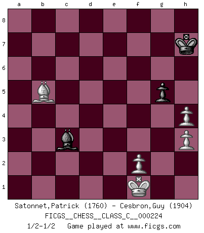 Last move : 1/2-1/2 2016 August 11 0:57:53 [Event "FICGS__CHESS__CLASS_C__000224"] [Site "FICGS"] [Date "2015.09.07"] [Round "1"] [White "Satonnet,Patrick"] [Black "Cesbron,Guy"] [Result "1/2-1/2"] [WhiteElo "1760"] [BlackElo "1904"] 1.Nf3 Nf6 2.c4 c6 3.d4 d5 4.g3 dxc4 5.Bg2 Nbd7 6.O-O Nb6 7.Qc2 g6 8.Nbd2 Bg7 9.Rd1 O-O 10.e4 Bg4 11.h3 Be6 12.a4 a5 13.Ng5 Qd7 14.Ndf3 h6 15.Ne5 Qc8 16.Nxe6 Qxe6 17.Be3 Nfd7 18.Nxd7 Nxd7 19.d5 cxd5 20.exd5 Qa6 21.Rac1 Rac8 22.d6 exd6 23.Bd5 Kh7 24.Bxc4 Qc6 25.Qb1 Nc5 26.b4 axb4 27.Qxb4 h5 28.Bd5 Qd7 29.Bg2 Nxa4 30.Rxc8 Rxc8 31.Rxd6 Qe7 32.Rb6 Qxb4 33.Rxb4 Nc5 34.Bd5 Rc7 35.Bxc5 Rxc5 36.Bxf7 b5 37.Be8 Bc3 38.Rxb5 Rxb5 39.Bxb5 g5 40.Kf1 h4 41.gxh4 1/2-1/2 Reti Opening Kingside Castling by player White (move 6) Kingside Castling by player Black (move 9) 10 pieces endgame at move 38 : White KBPPP , Black KRBPP WHITE : King + 1 Bishop 3 Pawns BLACK : King + 1 Rook 1 Bishop 2 Pawns 9 pieces endgame at move 39 : White KBPPP , Black KBPP WHITE : King + 1 Bishop 3 Pawns BLACK : King + 1 Bishop 2 Pawns 8 pieces endgame at move 41 : White KBPPP , Black KBP WHITE : King + 1 Bishop 3 Pawns BLACK : King + 1 Bishop 1 Pawn This chess game ended in a draw. Follow this game move after move (download)I have never in my life played the French Defence, which is the dullest of all openings. (Wilhelm Steinitz) Habe Mut, dich deines eigenen Verstandes zu bedienen. (Immanuel Kant) Coloca el contenido de las piezas del Ajedrez en un sombrero, agitalo vigorosamente, arrojalas en un tablero desde una altura de 30 centimetros y así obtendras el estilo de Steinitz. (H. E. Bird) A chaque perte on perd un peu de soi. (Joël Lautier) To err is human, to shift the blame on someone else is tactical. (Mladen Jankovic)