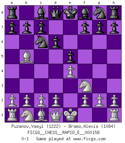 Last move : 0-1 2015 October 20 14:51:4 [Event "FICGS__CHESS__RAPID_E__000158"] [Site "FICGS"] [Date "2015.09.10"] [Round "1"] [White "Puzanov,Vasyl"] [Black "Bromo,Alexis"] [Result "0-1"] [WhiteElo "1222"] [BlackElo "1084"] 1.e4 e5 2.Nf3 Nc6 3.Bb5 d6 0-1 This chess game has been lost on time (started : 2015.09.10 23:56:36) Ruy Lopez : Old Steinitz defense Player Black won this chess game. Follow this game move after move (download)We cannot resist the fascination of sacrifice, since a passion for sacrifices is part of a Chessplayer's nature. (Rudolf Spielman) Je mehr ich von der FIDE weiss, um so weniger verstehe ich. (Alexander Kalifman) Alguna parte de un error es siempre correcto. (Savielly Tartakover) En blitz, le Cavalier l'emporte sur le Fou. (Vlastimil Hort) History is the quarrels of popes and kings, with wars or pestilences in every page; the men all so good for nothing, and hardly any women at all. (Jane Austen)