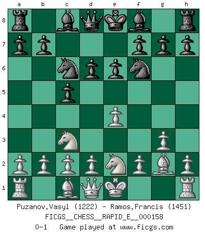 Last move : 0-1 2015 October 17 14:1:1 [Event "FICGS__CHESS__RAPID_E__000158"] [Site "FICGS"] [Date "2015.09.10"] [Round "1"] [White "Puzanov,Vasyl"] [Black "Ramos,Francis"] [Result "0-1"] [WhiteElo "1222"] [BlackElo "1451"] 1.e4 c5 2.Nc3 d6 3.g3 Nc6 4.Bg2 Nf6 5.Nge2 e6 0-1 This chess game has been lost on time (started : 2015.09.10 23:56:36) Sicilian : Closed Player Black won this chess game. Follow this game move after move (download)It is always better to sacrifice your opponent's men. (Savielly Tartakower) Ich moechte nie einem Club beitreten, der Leute wie mich als Mitglieder aufnimmt. (Woody Allen) Una clavada es mas poderosa que una espada. (Fred Reinfeld) Comme les marins qui ont mille raisons différentes d'aller en mer, les joueurs d'échecs en ont tout autant avant de s'installer devant une table et jouer... (Vincent Bertignac, philosophe) The difference between perseverance and obstinacy is that one comes from a strong will, and the other from a strong won't. (Henry Ward Beecher)