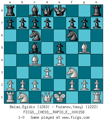 Last move : 1-0 2015 October 18 14:19:41 [Event "FICGS__CHESS__RAPID_E__000158"] [Site "FICGS"] [Date "2015.09.10"] [Round "1"] [White "Belaz,Egidio"] [Black "Puzanov,Vasyl"] [Result "1-0"] [WhiteElo "1263"] [BlackElo "1222"] 1.e4 e5 2.Nf3 Nc6 3.Bc4 Bc5 4.d3 Nf6 5.Bg5 1-0 This chess game has been lost on time (started : 2015.09.10 23:56:36) Giuoco Pianissimo Player White won this chess game. Follow this game move after move (download)In order to improve your game, you must study the endgame before everything else, for whereas the endings can be studied and mastered by themselves, the middle game and the opening must be studied in relation to the endgame. (Jose Raul Capablanca) Ich hatte Angst gegen einen russischen Großmeister zu verlieren, und er befürchtete gegen einen kleinen Jungen zu verlieren. (über ein Remis gegen Juri Awerbach). (Robert James Fischer) Debió haber existido una vez en que los hombres eran semidióses, de otra manera no hubiesen podido inventar el Ajedrez. (Gustav Schenk) Si le désir cupide (et stupide) de gagner est une inépuisable source de souffrance, une combinaison brillante sur l'échiquier est une découverte : le coquelicot qui s'épanouit lorsque apparaît la Voie Lactée. (Arrabal) The large trees attract high winds. (Chinese proverb)