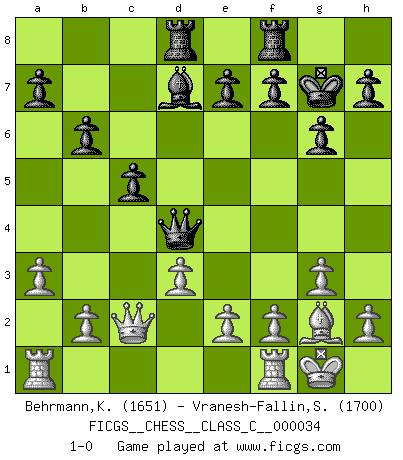 Last move : 1-0 2007 May 24 10:58:49 [Event "FICGS__CHESS__CLASS_C__000034"] [Site "FICGS"] [Date "2007.03.11"] [Round "1"] [White "Behrmann,Klaus"] [Black "Vranesh-Fallin,Scott"] [Result "1-0"] [WhiteElo "1651"] [BlackElo "1700"] 1.Nf3 Nf6 2.g3 g6 3.Bg2 Bg7 4.O-O O-O 5.c4 c5 6.d3 d5 7.Nc3 Nc6 8.cxd5 Nxd5 9.Nxd5 Qxd5 10.Be3 Bd7 11.Qc1 b6 12.Bh6 Rad8 13.Bxg7 Kxg7 14.a3 Nd4 15.Nxd4 Qxd4 16.Qc2 1-0 Reti : King's Indian attack Kingside Castling by player White (move 4) Kingside Castling by player Black (move 4) Player White won this chess game. Follow this game move after move (download)A bad day of Chess is better than any good day at work. (Anonymous) Wenn ein Kopf und ein Buch zusammenstoßen und es klingt hohl, ist es denn allemal im Buche? (Georg Christoph Lichtenberg) Un mal día en el Ajedrez, es mejor que cualquier buen día en el trabajo. (Anonymous) Les échecs sont utiles à l'exercice de la faculté de penser et à celle de l'imagination. Car nous devons posséder une méthode élaborée pour atteindre des buts partout où nous devons conduire notre raison. (Leibnitz) Hold em is to stud what chess is to checkers. (Johnny Moss)