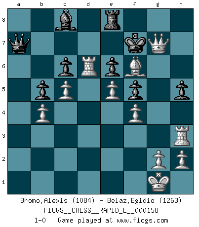 Last move : 1-0 2015 October 21 21:54:16 [Event "FICGS__CHESS__RAPID_E__000158"] [Site "FICGS"] [Date "2015.09.10"] [Round "1"] [White "Bromo,Alexis"] [Black "Belaz,Egidio"] [Result "1-0"] [WhiteElo "1084"] [BlackElo "1263"] 1.d4 e6 2.c4 Nf6 3.Nc3 Bb4 4.Bd2 O-O 5.a3 Be7 6.Nf3 d6 7.e3 c6 8.c5 d5 9.Bd3 b6 10.b4 b5 11.O-O a6 12.e4 dxe4 13.Nxe4 Nxe4 14.Bxe4 Bb7 15.Qc2 Nd7 16.Rfe1 Nf6 17.Ne5 Nxe4 18.Rxe4 Bf6 19.Rae1 Bxe5 20.dxe5 f5 21.R4e3 Qe7 22.Rg3 g6 23.Bg5 Qc7 24.f4 a5 25.Rd1 axb4 26.axb4 Rad8 27.Bxd8 Qb8 28.Bf6 Qc7 29.Rd6 Bc8 30.Qb3 Re8 31.Rh3 h5 32.Qg3 Qa7 33.Qxg6+ Kf8 34.Qh6+ Kf7 35.Qg7+ 1-0 Queen's pawn Kingside Castling by player Black (move 4) Kingside Castling by player White (move 11) Player White won this chess game. Follow this game move after move (download)Bobby is the finest Chess player this country ever produced. His memory for the moves, his brilliance in dreaming up combinations, and his fierce determination to win are uncanny. (John Collins) Gewinnen beim Schach fördert das Selbstvertrauen. Beim Sex spüre ich sowas nicht... (Garry Kasparov) a manera como él juega al Ajedrez, demuestra la completa naturaleza de un hombre. (Stanley Ellin) On peut tirer plus d'utilité d'une partie perdue que de 100 parties gagnées. (Capablanca) Establishing goals is all right if you don't let them deprive you of interesting detours. (Doug Larson)