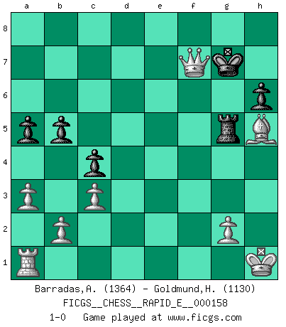 Last move : 1-0 2015 October 25 21:41:58 [Event "FICGS__CHESS__RAPID_E__000158"] [Site "FICGS"] [Date "2015.09.10"] [Round "1"] [White "Barradas,Anderson"] [Black "Goldmund,Heike"] [Result "1-0"] [WhiteElo "1364"] [BlackElo "1130"] 1.e4 d5 2.exd5 Qxd5 3.Nc3 Qa5 4.Nf3 Nf6 5.d3 Bf5 6.Bd2 c6 7.a3 Qc7 8.Nd4 Bg6 9.Qf3 e6 10.Be2 Nbd7 11.Ne4 Nxe4 12.dxe4 Bc5 13.c3 Ne5 14.Qg3 O-O 15.h4 Bd6 16.Bf4 Bxe4 17.f3 Rad8 18.O-O Nc4 19.Bxd6 Nxd6 20.fxe4 Qe7 21.Rf4 c5 22.Nf3 a6 23.Rg4 g6 24.Bd3 b5 25.h5 c4 26.Bc2 f5 27.exf5 exf5 28.Rg5 Qe2 29.Nd4 Qe7 30.hxg6 h6 31.Rh5 Kg7 32.Nc6 Ne4 33.Bxe4 Qc5+ 34.Kh1 Rde8 35.Bf3 Re6 36.Nd4 Rxg6 37.Qf4 a5 38.Nxf5+ Rxf5 39.Rxf5 Qe7 40.Bh5 Rg5 41.Rf7+ Qxf7 42.Qxf7+ 1-0 Scandinavian (centre counter) defense Kingside Castling by player Black (move 14) Kingside Castling by player White (move 18) Player White won this chess game. Follow this game move after move (download)Botvinnik tried to take the mystery out of Chess, always relating it to situations in ordinary life. He used to call Chess a typical inexact problem similar to those which people are always having to solve in everyday life. (Garry Kasparov) Du weisst es gibt ein Problem mit Computern und Fernschach, wenn jeder eine Rating von 2450 hat. (John Christen Knudsen) ¿Porque tengo que perder ante este idiota?. (Aron Nimzovich) Le pion, dans sa simplicité, marche droit devant lui, mais lorsqu'il prend, il le fait obliquement? Ainsi l'homme, tant qu'il reste pauvre, marche dans la droiture et vit honnêtement, mais lorsqu'il recherche les honneurs, il flatte, se parjure et, par les voies obliques, cherche une position supérieure sur l'échiquier du monde. (Jean de Galles) The message for business people contemplating their place in the cyberspace is simple and direct: get linked or get lost. (Vic Sussman and Kenan Pollack)
