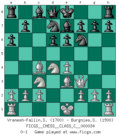 Last move : 0-1 2007 May 2 7:29:1 [Event "FICGS__CHESS__CLASS_C__000034"] [Site "FICGS"] [Date "2007.03.11"] [Round "1"] [White "Vranesh-Fallin,Scott"] [Black "Burgnies,Stephane"] [Result "0-1"] [WhiteElo "1700"] [BlackElo "1900"] 1.e4 c5 2.Nf3 d6 3.d4 cxd4 4.Nxd4 Nf6 5.Nc3 a6 6.Bc4 e6 7.Qf3 Be7 8.Be3 Nbd7 0-1 This chess game has been lost on time (started : 2007.03.11 19:54:18) Sicilian : Najdorf, Lipnitzky attack Player Black won this chess game. Follow this game move after move (download)Nothing excites jaded Grandmasters more than a theoretical novelty. (Dominic Lawson) Du musst Deinen Gegner in einen tiefen dunklen Wald führen wo 2+2=5 ist und wo der Weg, der wieder hinausführt, nur breit genug für einen ist. (Mikhail Nekhemyevich Tal) Es el objetivo de la escuela moderna no tratar cada posición de acuerdo a una regla general, sino de acuerdo al principio inherente en la posición. (Richard Reti) Les réformistes prétendent que les progrès de la théorie conduiront à la disparition des échecs, et qu'il faut, pour leur rendre vie, en remanier les règles. En réalité, qu'exprime cette affirmation? Le mépris de l'intuition, de l'imagination et de tous les autres éléments qui font des échecs un art. (Alexander Alekhine) Fear is the path to the dark side. Fear leads to anger; anger leads to hate; hate leads to suffering. I sense much fear in you. (Master Yoda in Star Wars ep.1)