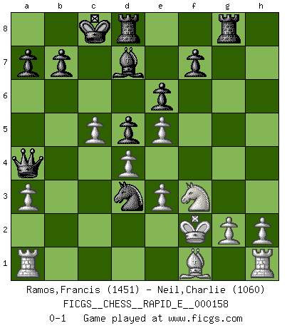 Last move : 0-1 2015 September 26 16:41:1 [Event "FICGS__CHESS__RAPID_E__000158"] [Site "FICGS"] [Date "2015.09.10"] [Round "1"] [White "Ramos,Francis"] [Black "Neil,Charlie"] [Result "0-1"] [WhiteElo "1451"] [BlackElo "1060"] 1.e4 e6 2.d4 d5 3.Nc3 Bb4 4.e5 c5 5.a3 Bxc3+ 6.bxc3 Ne7 7.Qg4 Nbc6 8.Qxg7 Rg8 9.Qxh7 Qc7 10.Qd3 cxd4 11.cxd4 Nf5 12.Nf3 Bd7 13.c4 O-O-O 14.c5 Qa5+ 15.Bd2 Qa4 16.Be3 Nxe3 17.fxe3 Nb4 18.Kf2 Nxd3+ 0-1 French : Winawer, Advance, poisoned pawn variation Queenside Castling by player Black (move 13) Player Black won this chess game. Follow this game move after move (download)You have to have the fighting spirit. You have to force moves and take chances. (Bobby Fischer) Die größte Kunst beim Schach besteht darin dem Gegner nicht zu zeigen was er tun kann. (Garry Kasparov) Preferería tener un Peón que un dedo. (Reuben Fine) Même si l'adversaire joue le coup analysé précédemment, recommencez l'analyse en voyant la nouvelle position. Première règle de Blumenfeld Experience is the name we all give to our mistakes. (Oscar Wilde)