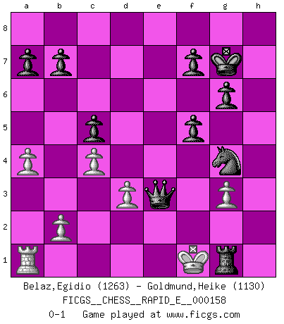 Last move : 0-1 2015 October 31 12:30:14 [Event "FICGS__CHESS__RAPID_E__000158"] [Site "FICGS"] [Date "2015.09.10"] [Round "1"] [White "Belaz,Egidio"] [Black "Goldmund,Heike"] [Result "0-1"] [WhiteElo "1263"] [BlackElo "1130"] 1.e4 d5 2.e5 c5 3.d3 Bf5 4.Nf3 Nd7 5.Nc3 d4 6.Nd5 e6 7.Ne3 dxe3 8.Bxe3 Qc7 9.Bf4 g6 10.Be2 Bg7 11.Nh4 Bxe5 12.Nxf5 exf5 13.Bxe5 Qxe5 14.O-O Ngf6 15.Re1 O-O 16.Bf3 Qc7 17.c4 Ne5 18.Be2 Neg4 19.g3 Rad8 20.a4 h5 21.Qd2 h4 22.Qg5 Kg7 23.Qxh4 Rh8 24.Qg5 Rxh2 25.Bxg4 Nxg4 26.Re2 Qc6 27.f3 Qxf3 28.Rxh2 Rh8 29.Qf4 Qxf4 30.Rg2 Qe3+ 31.Kf1 Rh1+ 32.Rg1 Rxg1+ 0-1 Scandinavian (centre counter) defense Kingside Castling by player White (move 14) Kingside Castling by player Black (move 15) Player Black won this chess game. Follow this game move after move (download)If one piece is badly posted, the whole game is bad. (Tarrasch) Ja, jede Frau in Holland liebt mich bestimmt, und alle Männer hassen mich. (Loek van Wely) Solo existe una cosa que Fischer hace en el Ajedrez sin placer: ¡perder!. (Boris Spassky) Je fais ceci parce que dans cinquante coups j'obtiendrai cela; je m'appelle Mikhail Moisevitch Botvinnik. (Botvinnik) A mistake is only a mistake if you let it happen twice. Otherwise it is a learning experience. (Daniel Parmet)