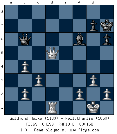 Last move : 1-0 2015 November 3 11:56:36 [Event "FICGS__CHESS__RAPID_E__000158"] [Site "FICGS"] [Date "2015.09.10"] [Round "1"] [White "Goldmund,Heike"] [Black "Neil,Charlie"] [Result "1-0"] [WhiteElo "1130"] [BlackElo "1060"] 1.e4 e5 2.Nf3 Nc6 3.Bc4 Nf6 4.Ng5 d5 5.exd5 Na5 6.Bb5+ c6 7.dxc6 Nxc6 8.Bc4 Be6 9.Nxe6 fxe6 10.Bxe6 Be7 11.d3 Qd6 12.Bb3 Nd4 13.c3 Nxb3 14.axb3 O-O 15.O-O a6 16.Re1 Rfe8 17.Na3 b5 18.b4 Rad8 19.Qb3+ Kh8 20.Nc2 Qxd3 21.Be3 h6 22.Rad1 Qg6 23.Bb6 Rxd1 24.Rxd1 e4 25.Ne3 Kh7 26.Nd5 Nxd5 27.Qxd5 Bf6 28.Qb7 Bg5 29.Qxa6 Bd8 30.Qxb5 Qxb6 31.Qxe8 Bf6 32.Qxe4+ Kg8 33.Qd5+ Kh7 34.g3 1-0 Two knights defense Kingside Castling by player Black (move 14) Kingside Castling by player White (move 15) Player White won this chess game. Follow this game move after move (download)Good positions don't win games, good moves do. (Gerald Abrahams) Wie ich sie so einen nach dem anderen nieder mähte wurde meine Überlegenheit offensichtlich. (José Raúl Capablanca) Cuando le juegas a Fischer, no es una cuestion de si vas a ganar o perder. Es una cuestion de si vas a sobrevivir. (Boris Spassky) En blitz, le Cavalier l'emporte sur le Fou. (Vlastimil Hort) The best teachers teach from the heart, not from the book. (Author unknown)