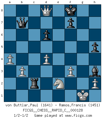 Last move : 1/2-1/2 2015 November 15 18:11:51 [Event "FICGS__CHESS__RAPID_C__000128"] [Site "FICGS"] [Date "2015.09.13"] [Round "1"] [White "von Buttlar,Paul"] [Black "Ramos,Francis"] [Result "1/2-1/2"] [WhiteElo "1641"] [BlackElo "1451"] 1.c4 Nf6 2.Nc3 g6 3.e4 d6 4.d4 Bg7 5.f3 O-O 6.Be3 c6 7.Bd3 a6 8.Nge2 b5 9.Qd2 Bb7 10.O-O Nbd7 11.Bh6 Nb6 12.cxb5 cxb5 13.g4 Rc8 14.Ng3 Nc4 15.Bxc4 Rxc4 16.Bxg7 Kxg7 17.Qg5 Bc8 18.Rad1 h6 19.Qe3 b4 20.Nce2 a5 21.g5 hxg5 22.Qxg5 Rh8 23.Rc1 Qc7 24.Rxc4 Qxc4 25.Qxa5 Bh3 26.e5 Nd5 27.b3 Qc6 28.Rc1 Qb7 29.exd6 exd6 30.a4 Nc3 31.Rxc3 bxc3 32.Qxc3 Rc8 33.Qe3 Rc2 34.Nh5+ gxh5 35.Qg5+ Kf8 36.Qd8+ Kg7 37.Qg5+ Kf8 38.Qd8+ 1/2-1/2 English Opening Kingside Castling by player Black (move 5) Kingside Castling by player White (move 10) This chess game ended in a draw. Follow this game move after move (download)Even the laziest King flees wildly in the face of a double check ! (Aaron Nimzowitsch) Im Hotelzimmer gab es nur zwei Schaben. (Über die Turnierbedingungen) (Peter Swidler) Entre mas años cumplo, mas valoro los Peones. (Keres) Soyez une menace à chaque fois que vous vous asseyez pour jouer. (Ken Smith) I don't believe in psychology. I believe in good moves. (Bobby Fischer)
