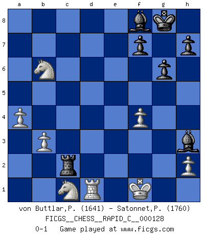 Last move : 0-1 2015 November 21 10:9:51 [Event "FICGS__CHESS__RAPID_C__000128"] [Site "FICGS"] [Date "2015.09.13"] [Round "1"] [White "von Buttlar,Paul"] [Black "Satonnet,Patrick"] [Result "0-1"] [WhiteElo "1641"] [BlackElo "1760"] 1.c4 Nf6 2.Nc3 g6 3.e4 d6 4.d4 Bg7 5.f3 O-O 6.Be3 e5 7.d5 c6 8.Bd3 b5 9.dxc6 bxc4 10.Bxc4 Nxc6 11.Nge2 Na5 12.Qa4 Nxc4 13.Qxc4 Be6 14.Qd3 d5 15.exd5 Nxd5 16.O-O Nxe3 17.Qxe3 Qb8 18.b3 Qb6 19.Qxb6 axb6 20.Rfd1 Rfc8 21.Kf1 e4 22.Rac1 exf3 23.gxf3 Bh6 24.f4 Bf8 25.Na4 Rxc1 26.Nxc1 Rc8 27.Nxb6 Rc2 28.a4 Bh3+ 0-1 English Opening Kingside Castling by player Black (move 5) Kingside Castling by player White (move 16) Player Black won this chess game. Follow this game move after move (download)When you absolutely don't know what to do anymore, it is time to panic. (John van der Wiel) Das Schach hält seine Meister in eigenen Banden, Fesseln; auf vielerlei Weise formt es ihren Geist, so dass die innere Freiheit selbst des Stärksten beeinflusst wird. (Albert Einstein) La caracteristica mas importante en la posición del Ajedrez es la actividad de las piezas. Esto es absolutamente fundamental en todas las fases del juego: Apertura, Juego Medio y especialmente Finales. La limitación primordial en la actividad de una pieza, es la estructuración de los Peones. (Michael Stean) C'est une question de caractère, Beaucoup de gens perdent leur motivation très vite. D'autres, ils sont rares, peuvent la conserver très longtemps. J'aime les échecs, encore aujourd'hui je suis heureux d'analyser des parties. J'aime toujours gagner, je déteste encore perdre. Bien jouer est important pour mon intégrité intellectuelle et morale. Et puis les échecs vivent en ce moment une période historique grâce à Internet. Ils se développent dans les systèmes éducatifs à travers le monde. Ils sortent de leur ghetto, et c'est mon rôle de mener à bien cette révolution. (Gary Kasparov) True nature is revealed in times of difficulty. (Chinese proverb)