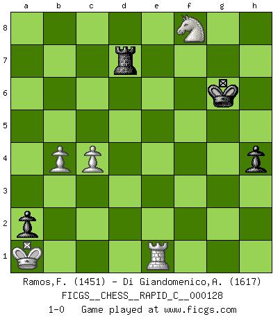 Last move : 1-0 2015 December 6 23:28:15 [Event "FICGS__CHESS__RAPID_C__000128"] [Site "FICGS"] [Date "2015.09.13"] [Round "1"] [White "Ramos,Francis"] [Black "Di Giandomenico,Alfonso"] [Result "1-0"] [WhiteElo "1451"] [BlackElo "1617"] 1.e4 c5 2.Nf3 d6 3.d4 cxd4 4.Nxd4 Nf6 5.Nc3 g6 6.Be3 Bg7 7.Qd2 Ng4 8.O-O-O Nxe3 9.Qxe3 Nd7 10.Kb1 a6 11.h4 Nf6 12.f3 b5 13.g4 h5 14.g5 Nd7 15.Nd5 Bb7 16.Bh3 e6 17.Bxe6 Nc5 18.Bh3 O-O 19.Rhe1 Re8 20.Qd2 Bxd5 21.exd5 Qb6 22.Nc6 Na4 23.c3 a5 24.Bd7 Rf8 25.Re7 Nc5 26.Rde1 b4 27.c4 Na4 28.f4 Bxb2 29.f5 Bc3 30.Qc2 Bxe1 31.Rxe1 b3 32.axb3 Nc5 33.Ne7+ Kg7 34.Bb5 a4 35.b4 Nb3 36.fxg6 Nd4 37.Qd3 f6 38.Qxd4 Qxd4 39.Nf5+ Kxg6 40.Nxd4 fxg5 41.Ne6 Rf2 42.Nxg5 a3 43.Ne4 a2+ 44.Ka1 Rh2 45.Nxd6 Rxh4 46.Ne8 Rg4 47.d6 h4 48.Nc7 Rd8 49.d7 Rd4 50.Ne6 R8xd7 51.Bxd7 Rxd7 52.Nf8+ 1-0 Sicilian : Dragon, 6.Be3 Queenside Castling by player White (move 8) Kingside Castling by player Black (move 18) 10 pieces endgame at move 51 : White KRBNPP , Black KRPP WHITE : King + 1 Rook 1 Bishop 1 Knight 2 Pawns BLACK : King + 1 Rook 2 Pawns 9 pieces endgame at move 51 : White KRNPP , Black KRPP WHITE : King + 1 Rook 1 Knight 2 Pawns BLACK : King + 1 Rook 2 Pawns Player White won this chess game. Follow this game move after move (download)The older I grow, the more I value Pawns. (Keres) Ich spiele 70 Eröffnungssysteme. (Viktor Kortschnoi) El Ajedrez demanda una total concentración. (Bobby Fischer) Tout change constamment, y compris dans le monde des Echecs. (Botvinnik) Better than a thousand days of diligent study is one day with a great teacher. (Japanese proverb)