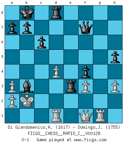 Last move : 0-1 2015 December 11 7:23:38 [Event "FICGS__CHESS__RAPID_C__000128"] [Site "FICGS"] [Date "2015.09.13"] [Round "1"] [White "Di Giandomenico,Alfonso"] [Black "Domingo,Jordi"] [Result "0-1"] [WhiteElo "1617"] [BlackElo "1755"] 1.e4 e5 2.Bc4 Nc6 3.Nf3 f5 4.d3 Nf6 5.Bg5 d6 6.Nbd2 h6 7.Bxf6 Qxf6 8.c3 g5 9.h3 Bd7 10.Qe2 O-O-O 11.O-O-O Na5 12.Ne1 c6 13.f3 f4 14.Nc2 Bg7 15.Na3 h5 16.Nb3 Nxc4 17.Nxc4 d5 18.Na3 Kb8 19.Nc5 Bc8 20.Qc2 Bf8 21.d4 Qg7 22.Rhe1 g4 23.Rg1 exd4 24.cxd4 dxe4 25.Qxe4 Qf7 26.Nb3 Bxa3 27.bxa3 Rhe8 28.Qd3 gxh3 29.gxh3 Re3 30.Qf1 Be6 31.Kb2 Bxb3 0-1 Bishop's Opening Queenside Castling by player Black (move 10) Queenside Castling by player White (move 11) Player Black won this chess game. Follow this game move after move (download)During a Chess competition a Chessmaster should be a combination of a beast of prey and a monk. (Alexander Alekhine) Smyslow ist ein Beweis dafür, dass ich noch zehn Jahre spielen kann! [der 75 jährige über den 85 jährigen] (Viktor Kortschnoi) Un Peón pasado es un criminal, quién debe ser mantenido bajo candado y llave. Leves medidas, tales como vigilancia policiaca, no son suficientes. (Aaron Nimzovich) Ce qui caractérise les parties de combat, c'est que si le défenseur a constamment de difficiles problèmes à résoudre, l'attaquant doit chercher sans relâche de nouvelles possibilités d'attaque. (Koblentz) Waiting for chance ? Play in casinos. (FICGS proverb)