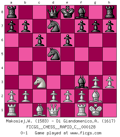 Last move : 0-1 2015 October 25 14:53:53 [Event "FICGS__CHESS__RAPID_C__000128"] [Site "FICGS"] [Date "2015.09.13"] [Round "1"] [White "Makosiej,Wladyslaw"] [Black "Di Giandomenico,Alfonso"] [Result "0-1"] [WhiteElo "1583"] [BlackElo "1617"] 1.c4 Nf6 2.Nc3 d5 3.cxd5 Nxd5 4.g3 c6 5.Bg2 Bg4 6.Nf3 Nd7 7.O-O e6 8.h3 Bxf3 0-1 This chess game has been lost on time (started : 2015.09.13 9:2:0) English : Anglo-Gruenfeld defense Kingside Castling by player White (move 7) Player Black won this chess game. Follow this game move after move (download)Chess is no whit inferior to the violin, and we have a large number of professional violinists. (Mikhail Botvinnik) Verschiedene, sehr schätzbare und im Laufe des Lebens nützliche Eigenschaften des Geistes können durch das Schachspiel erworben und gekräftigt werden, so dass sie zu Gewohnheiten werden, die uns nie im Stich lassen. (Benjamin Franklin) El Ajedrez es la vida. (Bobby Fischer) Même un GMI sait rarement calculer sur plus de cinq coups une attaque à sacrifices. (Rudolf Spielmann) I feel so... helpless. (C-3PO in Star Wars ep.3)