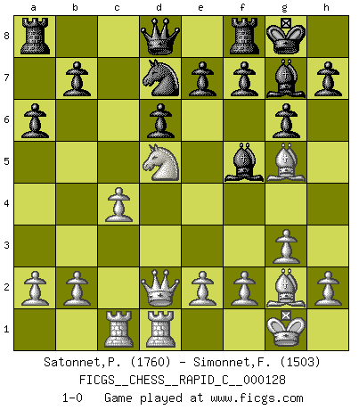 Last move : 1-0 2015 November 22 19:22:26 [Event "FICGS__CHESS__RAPID_C__000128"] [Site "FICGS"] [Date "2015.09.13"] [Round "1"] [White "Satonnet,Patrick"] [Black "Simonnet,Franck"] [Result "1-0"] [WhiteElo "1760"] [BlackElo "1503"] 1.Nf3 Nf6 2.c4 c5 3.g3 Nc6 4.Bg2 g6 5.O-O Bg7 6.Nc3 d6 7.d4 cxd4 8.Nxd4 Nxd4 9.Qxd4 O-O 10.Qd3 a6 11.Rd1 Qb6 12.Be3 Qc7 13.Rac1 Bf5 14.Qd2 Nd7 15.Nd5 Qd8 16.Bg5 1-0 This chess game has been lost on time (started : 2015.09.13 9:2:0) Reti Opening Kingside Castling by player White (move 5) Kingside Castling by player Black (move 9) Player White won this chess game. Follow this game move after move (download)Winning isn't everything... but losing is nothing. (Mednis) Das ganze Leben mit einer Ehefrau ist wie ein Endspiel mit ungleichfarbigen Läufern. (Viktor Kortschnoi) Todo se encuentra en un estado de flujo y esto incluye al mundo del Ajedrez. (Mikhail Botvinnik) Psychologiquement, tu dois avoir confiance en toi même, mais cette confiance doit être basée sur des faits. (Robert Fischer) A bird doesn't sing because it has an answer, it sings because it has a song. (Maya Angelou)