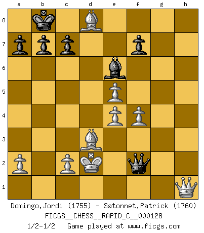 Last move : 1/2-1/2 2015 November 16 20:57:51 [Event "FICGS__CHESS__RAPID_C__000128"] [Site "FICGS"] [Date "2015.09.13"] [Round "1"] [White "Domingo,Jordi"] [Black "Satonnet,Patrick"] [Result "1/2-1/2"] [WhiteElo "1755"] [BlackElo "1760"] 1.g4 g5 2.h4 gxh4 3.d4 d5 4.Rxh4 Nc6 5.Nf3 e5 6.dxe5 Be6 7.Qd3 Qd7 8.Bg5 Bg7 9.Nc3 h6 10.Be3 Nge7 11.O-O-O O-O-O 12.g5 Nf5 13.gxh6 Bxh6 14.Bxh6 Nxh4 15.Bg7 Rhg8 16.Bf6 Nxf3 17.Qxf3 Ne7 18.Qh1 Kb8 19.e4 d4 20.f4 Qc6 21.Bxe7 dxc3 22.Rxd8+ Rxd8 23.Bxd8 cxb2+ 24.Kxb2 Qb6+ 25.Kc3 Qe3+ 26.Bd3 Qc5+ 27.Kd2 Qf2+ 28.Be2 Qd4+ 29.Bd3 Qf2+ 30.Be2 Qd4+ 31.Bd3 Qf2+ 1/2-1/2 Grob's attack Queenside Castling by player White (move 11) Queenside Castling by player Black (move 11) This chess game ended in a draw. Follow this game move after move (download)I still hope to kill Fischer. (Boris Spassky) Irgendwie scheint mir sonntags früh um 9 Uhr der Killerinstinkt verloren gegangen zu sein. (Alexej Shirov) Un Peón pasado aumenta su poder a medida de que el número de piezas en el tablero disminuye. (Capablanca) Si rien de grave n'est détecté lors de l'analyse d'une position, on joue alors le coup. Seconde règle de Blumenfeld. There are three kinds of lies: lies, damned lies and statistics. (Mark Twain)