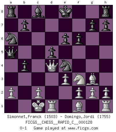 Last move : 0-1 2015 September 24 20:1:45 [Event "FICGS__CHESS__RAPID_C__000128"] [Site "FICGS"] [Date "2015.09.13"] [Round "1"] [White "Simonnet,Franck"] [Black "Domingo,Jordi"] [Result "0-1"] [WhiteElo "1503"] [BlackElo "1755"] 1.d4 d5 2.Nf3 Nf6 3.Bf4 c5 4.dxc5 e6 5.b4 a5 6.Nc3 axb4 7.Nb5 Na6 8.Nd6+ Bxd6 9.cxd6 Ne4 10.e3 Nxd6 11.Qd4 f6 12.O-O-O Ne4 13.Bg3 Qa5 0-1 Queen's Bishop game Queenside Castling by player White (move 12) Player Black won this chess game. Follow this game move after move (download)Chess is like life. (Boris Spassky) Das Zentrum ist der Balkan des Schachbretts - Kriegshandlungen können in jedem Moment ausbrechen. (Aaron Nimzowitsch) No hay precio que sea tan grande por la cabellera del Rey enemigo. (Koblentz) A chaque perte on perd un peu de soi. (Joël Lautier) Computers have lots of memory but no imagination. (Anonymous)