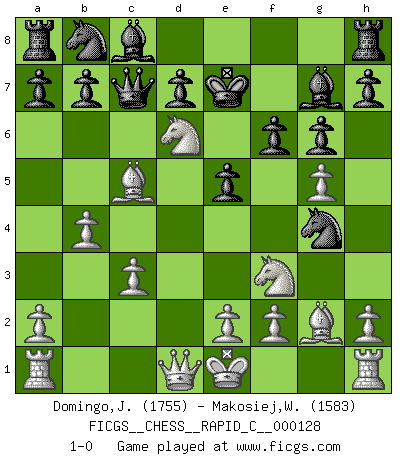 Last move : 1-0 2015 November 10 18:46:31 [Event "FICGS__CHESS__RAPID_C__000128"] [Site "FICGS"] [Date "2015.09.13"] [Round "1"] [White "Domingo,Jordi"] [Black "Makosiej,Wladyslaw"] [Result "1-0"] [WhiteElo "1755"] [BlackElo "1583"] 1.g4 g6 2.d4 Bg7 3.Bg2 c5 4.dxc5 Qa5+ 5.c3 Qxc5 6.Be3 Qc7 7.Nf3 Nf6 8.g5 Ng4 9.Bd4 f6 10.Na3 e5 11.Nb5 Qa5 12.Nd6+ Ke7 13.b4 Qc7 14.Bc5 1-0 Grob's attack Player White won this chess game. Follow this game move after move (download)The only thing Chess players have in common is Chess. (Lodewijk Prins) Der Schachmeister von Heute braucht Courage, einen Killerinstinkt, Ausdauer und Arroganz. (Larry Evans) Repentinamente, me resultaba obvio en mi analisis que yo había pasado por alto lo que Fischer había visto en el tablero con la mas grande facilidad. (Mikhail Botvinnik) Soyez une menace à chaque fois que vous vous asseyez pour jouer. (Ken Smith) Life is like a ten-speed bicycle: most of us have gears we never use. (Charles M. Schulz)