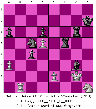 Last move : 0-1 2015 November 23 8:45:48 [Event "FICGS__CHESS__RAPID_A__000183"] [Site "FICGS"] [Date "2015.09.14"] [Round "1"] [White "Salonen,Jukka"] [Black "Galus,Stanislaw"] [Result "0-1"] [WhiteElo "1920"] [BlackElo "1919"] 1.d4 Nf6 2.c4 e6 3.Nf3 b6 4.g3 Bb7 5.Bg2 Be7 6.O-O O-O 7.Nc3 Ne4 8.Bd2 Bf6 9.Rc1 c5 10.d5 exd5 11.cxd5 Nxd2 12.Nxd2 d6 13.Nde4 Be5 14.f4 Bd4+ 15.Kh1 Ba6 16.Rf3 Re8 17.a3 Bc8 18.Rf1 a6 19.b4 Ra7 20.Qd2 Rae7 21.Rfe1 g6 22.h3 Bg7 23.bxc5 bxc5 24.Kh2 h6 25.g4 f5 26.Rb1 Qc7 27.Ng3 fxg4 28.hxg4 Bxg4 29.Qc2 g5 30.fxg5 Nd7 31.gxh6 Be5 32.Bh3 Kh8 33.Bxg4 Rg8 34.Rg1 Rxg4 35.Kh3 Rc4 36.Rb3 Rf7 37.Qb1 Qc8 38.Nd1 Rcf4 39.Kg2 Qg8 40.h7 Qg7 41.Rh1 Qf6 42.Rh5 Rg4 43.Rf5 Qxf5 44.Qxf5 Rxf5 45.Nf2 Rg6 46.Nfh1 c4 47.Rb7 Nc5 48.Rb8+ Kxh7 49.Rb1 Bxg3 0-1 Queen's Indian : Old Main line, 7.Nc3 Kingside Castling by player White (move 6) Kingside Castling by player Black (move 6) Player Black won this chess game. Follow this game move after move (download)I had a toothache during the first game. In the second game I had a headache. In the third game it was an attack of rheumatism. In the fourth game, I wasn't feeling well. And in the fifth game? Well, must one have to win every game ? (Siegbert Tarrasch) Über Kasparov: Es ist offensichtlich, daß er in einem totalitären Staat aufwuchs und deshalb zu diktatorischen Zügen neigt. (Viktor Kortschnoi) Siempre es mucho mejor sacrificar las piezas de tu oponente. (Savielly Tartakover) C'est une question de caractère, Beaucoup de gens perdent leur motivation très vite. D'autres, ils sont rares, peuvent la conserver très longtemps. J'aime les échecs, encore aujourd'hui je suis heureux d'analyser des parties. J'aime toujours gagner, je déteste encore perdre. Bien jouer est important pour mon intégrité intellectuelle et morale. Et puis les échecs vivent en ce moment une période historique grâce à Internet. Ils se développent dans les systèmes éducatifs à travers le monde. Ils sortent de leur ghetto, et c'est mon rôle de mener à bien cette révolution. (Gary Kasparov) War is the child of passion, passion is the child of narcissism and narcissism is the child. (...) Another game ? (Thibault de Vassal)