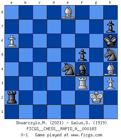 Last move : 0-1 2015 December 30 14:27:35 [Event "FICGS__CHESS__RAPID_A__000183"] [Site "FICGS"] [Date "2015.09.14"] [Round "1"] [White "Skwarczylo,Marek"] [Black "Galus,Stanislaw"] [Result "0-1"] [WhiteElo "2021"] [BlackElo "1919"] 1.d4 Nf6 2.Nf3 g6 3.c4 Bg7 4.Nc3 O-O 5.e4 d6 6.Be2 e5 7.O-O Nc6 8.d5 Ne7 9.Ne1 Nd7 10.Nd3 f5 11.Bd2 Kh8 12.f3 Nf6 13.c5 dxc5 14.Nxc5 c6 15.d6 Qxd6 16.Be3 Qc7 17.Qb3 b6 18.Ne6 Bxe6 19.Qxe6 Rae8 20.Qb3 c5 21.Qa4 Nc6 22.Bb5 Rc8 23.exf5 gxf5 24.Ba6 Rcd8 25.Rad1 Rxd1 26.Rxd1 e4 27.Bb5 Ne5 28.Be2 exf3 29.gxf3 Qb7 30.Rf1 Ne8 31.Kh1 Nc7 32.Qb3 Qc6 33.a4 c4 34.Qc2 a6 35.Bg1 Ng6 36.Rd1 Nf4 37.Qd2 Nce6 38.Qd6 Qb7 39.Qxb6 Qxb6 40.Bxb6 Bxc3 41.Bxc4 Bxb2 42.Bxa6 Ra8 43.Bb5 Ba3 44.Bf2 Kg7 45.Bg3 Bb2 46.Rb1 Bd4 47.Rd1 Rc8 48.h3 Nh5 49.Be1 Rc2 50.Bd3 Rc5 51.Bb4 Rc8 52.a5 Kf6 53.Be1 Be3 54.Bh4+ Ng5 55.a6 Kg6 56.Rf1 Rc3 57.Bb5 Rc2 58.Ba4 Ra2 59.Be8+ Kh6 60.f4 Ne4 61.Rf3 Ra1+ 62.Kh2 Bxf4+ 63.Kg2 Ra2+ 0-1 King's Indian : East Indian defense Kingside Castling by player Black (move 4) Kingside Castling by player White (move 7) Player Black won this chess game. Follow this game move after move (download)Excellence at Chess is one mark of a scheming mind. (Sir Arthur Conan Doyle) Das Schachspiel hat wie die Liebe, die Musik, die Fähigkeit, den Menschen glücklich zu machen. Ich habe ein leises Gefühl des Bedauerns für jeden, der das Schachspiel nicht kennt, so wie ich jeden bedaure, der die Liebe nicht kennt. (Siegbert Tarrasch) ¿Quién es tu oponente esta tarde? Esta tarde mi oponente son las piezas negras. (Akiba Rubinstein) L'attaque fait le spectacle, la défense gagne les matchs. (Dicton footballistique) No enterprise is more likely to succeed than one concealed from the enemy until it is ripe for execution. (Niccolo Machiavelli)