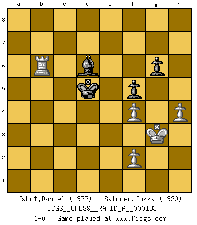 Last move : 1-0 2015 December 21 16:19:22 [Event "FICGS__CHESS__RAPID_A__000183"] [Site "FICGS"] [Date "2015.09.14"] [Round "1"] [White "Jabot,Daniel"] [Black "Salonen,Jukka"] [Result "1-0"] [WhiteElo "1977"] [BlackElo "1920"] 1.e4 e5 2.Nf3 Nc6 3.Bb5 a6 4.Ba4 Nf6 5.O-O Be7 6.Re1 b5 7.Bb3 d6 8.c3 O-O 9.h3 Nd7 10.d4 Bf6 11.a4 Bb7 12.Na3 exd4 13.cxd4 Nb6 14.Bf4 bxa4 15.Bxa4 Nxa4 16.Qxa4 a5 17.Bd2 Nb4 18.Bxb4 axb4 19.Qxb4 Qb8 20.Qb5 g6 21.Rac1 Bg7 22.Nc4 Ra7 23.Qg5 f5 24.e5 Bxf3 25.gxf3 d5 26.Ne3 Qxb2 27.Nxd5 Ra2 28.Qg2 Qxd4 29.Nxc7 Bxe5 30.Ne6 Qd6 31.Nxf8 Kxf8 32.Qg5 Kg7 33.Red1 Bd4 34.Qh4 Ra4 35.Kg2 Rb4 36.Rd2 Be5 37.Rxd6 Rxh4 38.Rd5 Bf4 39.Rc6 Bg5 40.Rd7+ Kh6 41.Rf7 Rb4 42.R6c7 Bd8 43.Rxh7+ Kg5 44.Rc6 Rb6 45.h4+ Kf4 46.Rxb6 Bxb6 47.Rd7 Ke5 48.Rb7 Bd4 49.Rb4 Kd5 50.Kg3 Be5+ 51.f4 Bd6 52.Rb6 1-0 Ruy Lopez : Closed Kingside Castling by player White (move 5) Kingside Castling by player Black (move 8) 10 pieces endgame at move 46 : White KRRPPP , Black KBPP WHITE : King + 2 Rooks 3 Pawns BLACK : King + 1 Bishop 2 Pawns 9 pieces endgame at move 46 : White KRPPP , Black KBPP WHITE : King + 1 Rook 3 Pawns BLACK : King + 1 Bishop 2 Pawns Player White won this chess game. Follow this game move after move (download)A strong memory, concentration, imagination, and a strong will is required to become a great Chess player. (Bobby Fischer) Mein erstes Ziel war nicht, die Partie zu gewinnen, sondern eine Figur zu opfern. -- der junge (Wilhelm Steinitz) El ganar no lo es todo... pero el perder es nada. (Mednis) Votre seul travail dans les ouvertures est d'obtenir un milieu de partie jouable. (Lajos Portish) When you stop learning you start dying. (M. Scott Adams)