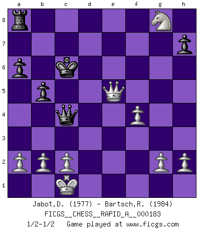Last move : 1/2-1/2 2015 October 21 20:0:51 [Event "FICGS__CHESS__RAPID_A__000183"] [Site "FICGS"] [Date "2015.09.14"] [Round "1"] [White "Jabot,Daniel"] [Black "Bartsch,Reinhard Andrea"] [Result "1/2-1/2"] [WhiteElo "1977"] [BlackElo "1984"] 1.e4 c5 2.Nf3 d6 3.d4 cxd4 4.Nxd4 Nf6 5.Nc3 a6 6.Bg5 e6 7.f4 Nbd7 8.Qf3 Qc7 9.O-O-O b5 10.Bd3 Bb7 11.Rhe1 Be7 12.Nd5 exd5 13.Nf5 dxe4 14.Bxe4 Nxe4 15.Bxe7 d5 16.Rxd5 Bxd5 17.Rxe4 Ne5 18.Bd6 Bxe4 19.Qxe4 Qc6 20.Qxe5+ Kd7 21.Qe7+ Kc8 22.Qxf7 Qc4 23.Qxg7 Rg8 24.Ne7+ Kd7 25.Nxg8 Kxd6 26.Qe5+ Kc6 1/2-1/2 Sicilian : Najdorf, 7.f4 Queenside Castling by player White (move 9) This chess game ended in a draw. Follow this game move after move (download)A bad day of Chess is better than any good day at work. (Anonymous) Nicht daß Diemer aus Opportunismus Mitglied der NSDAP geworden wäre. Er war ein Fanatiker, in allem, was er tat. (Hans Ree) El Ajedrez es en su esencia, un juego. En su forma, un arte. Y en su ejecución, una ciencia. (Baron Tassilo) Les échecs, c'est la lutte contre l'erreur. (Johannes Zukertort) I couldn't make any sense out of what this particular thread is about. It sounds like R2 D2 computer speaking. A space fight ?!? Some 'command' problems in Moscow ? Some killers & narcotic addicts attacking some game & a god wannabe ?? (Dinesh De Silva, lost in a russian conflict in FICGS forum)