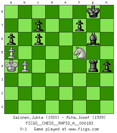 Last move : 0-1 2015 November 12 9:31:34 [Event "FICGS__CHESS__RAPID_A__000183"] [Site "FICGS"] [Date "2015.09.14"] [Round "1"] [White "Salonen,Jukka"] [Black "Riha,Josef"] [Result "0-1"] [WhiteElo "1920"] [BlackElo "1939"] 1.d4 Nc6 2.d5 Ne5 3.e4 e6 4.Nc3 exd5 5.Qxd5 d6 6.Be3 Nf6 7.Qd2 Be7 8.h3 O-O 9.f4 Ng6 10.Nf3 d5 11.exd5 Bb4 12.O-O-O Qd6 13.Qd4 Bf5 14.Bc4 Bxc3 15.Qxc3 Nxf4 16.Qd2 Ng6 17.Qd4 Rfe8 18.Bg5 Re4 19.Qc3 Nf4 20.Bxf6 gxf6 21.g4 Bg6 22.h4 h6 23.h5 Bh7 24.Nd4 a6 25.Rh2 Rae8 26.Rf2 Qe5 27.Qd2 Qg5 28.Nf3 Qxg4 29.b3 Qxh5 30.a4 Re3 31.Rg1+ Bg6 32.Rg3 R8e4 33.Rh2 Qf5 34.Kb2 h5 35.a5 Kg7 36.Rh4 Ne2 37.Rxe4 Qxe4 38.Bd3 Qe7 39.Bxe2 Rxe2 40.Qc3 Qd6 41.Rg1 Qxd5 42.Rg3 Qd1 43.Nd4 Re1 44.Ka2 Qb1+ 45.Ka3 Qc1+ 46.Ka4 Re4 47.b4 h4 48.Nf5+ Kg8 49.Qxf6 Qxc2+ 50.Ka3 Qc1+ 51.Ka4 Qc6+ 52.Qxc6 bxc6 53.Rg4 Rxg4 0-1 Queen's pawn : Lundin (Kevitz-Mikenas) defense Kingside Castling by player Black (move 8) Queenside Castling by player White (move 12) Player Black won this chess game. Follow this game move after move (download)The Pin is mightier than the sword. (Fred Reinfeld) Ich tröste mich mit dem Vergnügen, daß Schachfans, Zuschauer und Leser glücklich sind, wenn ein Großmeister etwas riskiert, statt nur Klötzchen zu schieben. (Mikhail Nekhemyevich Tal) Solo puedes ser bueno en el Ajedrez si amas al juego. (Bobby Fischer) Il n'y a pas de prix trop élevé au scalp de l'ennemi. (Koblentz) I teach you to lie, cheat and steal, and as soon as my back's turned you wait in line ? (Gregory House, House M.D.)