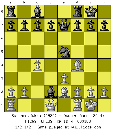 Last move : 1/2-1/2 2015 September 25 9:25:29 [Event "FICGS__CHESS__RAPID_A__000183"] [Site "FICGS"] [Date "2015.09.14"] [Round "1"] [White "Salonen,Jukka"] [Black "Daanen,Aard"] [Result "1/2-1/2"] [WhiteElo "1920"] [BlackElo "2044"] 1.d4 Nf6 2.c4 e5 3.dxe5 Ng4 4.Bf4 Nc6 5.Nf3 Bb4+ 6.Nbd2 Qe7 7.e3 Ngxe5 8.Nxe5 Nxe5 9.Be2 O-O 10.O-O Bxd2 1/2-1/2 Budapest : Rubinstein variation Kingside Castling by player Black (move 9) Kingside Castling by player White (move 10) This chess game ended in a draw. Follow this game move after move (download)Do you realize Fischer almost never has any bad pieces? He exchanges them, and the bad pieces remain with his opponents. (Yuri Balashov) Obwohl ich alt bin, darf mir niemand den Finger in den Mund stecken, sonst beisse ich. (Wilhelm Steinitz) Todavía soy una víctima del Ajedrez. Tiene toda la belleza del arte y mucho mas. No puede ser comercializado. El Ajedrez es mas puro que el arte en su posición social. (Marcel Duchamp) Même un GMI sait rarement calculer sur plus de cinq coups une attaque à sacrifices. (Rudolf Spielmann) Are you threatening me, Master Jedi ? (Chancellor Palpatine in Star Wars ep.3)