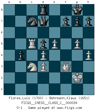 Last move : 0-1 2007 October 10 6:10:40 [Event "FICGS__CHESS__CLASS_C__000034"] [Site "FICGS"] [Date "2007.03.11"] [Round "1"] [White "Flores,Luis"] [Black "Behrmann,Klaus"] [Result "0-1"] [WhiteElo "1700"] [BlackElo "1651"] 1.b4 c6 2.Bb2 d5 3.e3 Nf6 4.d4 Bf5 5.Nd2 e6 6.a3 b5 7.Ngf3 a5 8.bxa5 Qxa5 9.Bd3 Bd6 10.O-O O-O 11.Ne5 Qc7 12.f4 Nbd7 13.Qf3 Ra4 14.g4 Bxd3 15.cxd3 Rfa8 16.Rac1 Bxa3 17.Nxc6 Qd6 18.Bxa3 Rxa3 19.g5 Ne8 20.e4 Nb8 21.e5 Qd7 22.f5 Nxc6 23.fxe6 Qxe6 24.Rxc6 Qe7 25.Nb1 Ra1 26.h4 Nc7 27.Nc3 Rxf1+ 28.Kxf1 Rd8 29.Rc5 Qd7 30.Kg2 b4 0-1 This chess game has been lost on time (started : 2007.03.11 19:54:18) Polish : Outflank variation Kingside Castling by player White (move 10) Kingside Castling by player Black (move 10) Player Black won this chess game. Follow this game move after move (download)Any material change in a position must come about by mate, a capture, or a Pawn promotion. (Purdy) Ich würde die 30 stärksten Spieler der USA im Simultanspiel besiegen. (José Raúl Capablanca) Vive, pierde y aprende al observar a tu oponente como ganar. (Amber Steenbock) Le temps de noter son nom sur la feuille de partie, j'étais déjà en zeitnot ! D'un modeste amateur apparié lors de la première ronde d'un open contre le grand-maître Azmaïparashvili. The bottom line is always the bottom line. (Johann Piek)